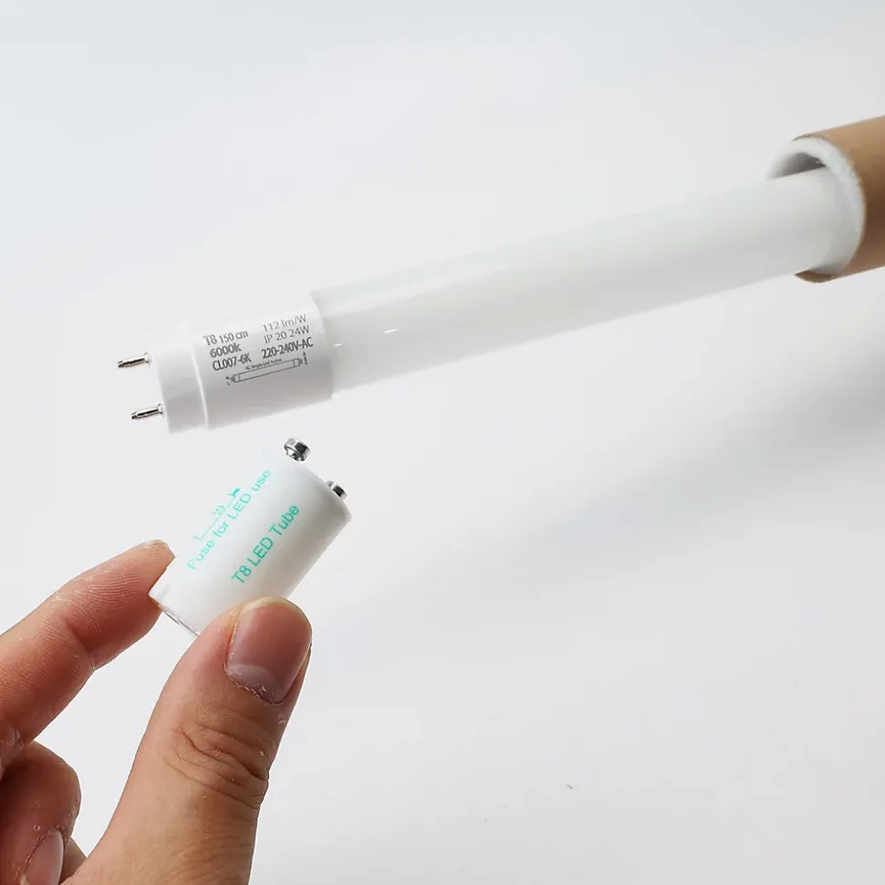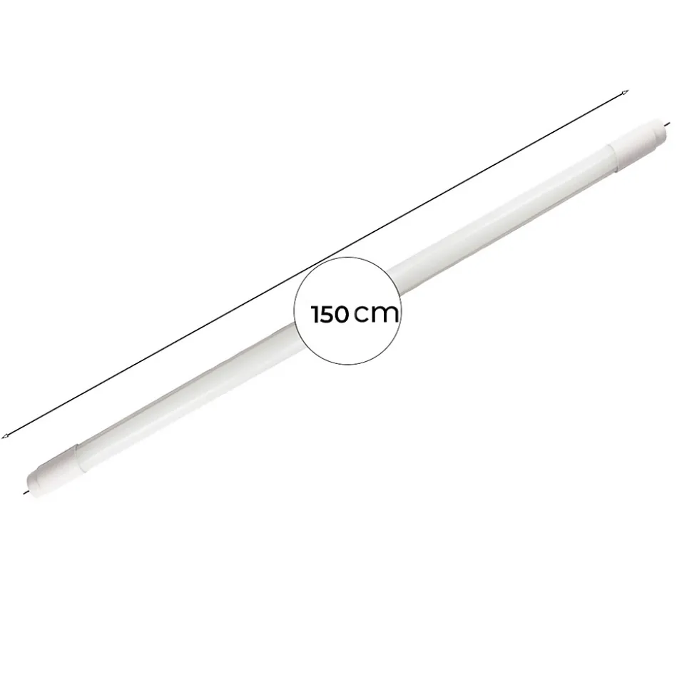 Tube LED T8 en verre 150cm 24W Caractéristiques principales : Puissance : 24W Efficacité : 112 LM/W Facteur de puissance : 0,95 Angle douverture : 330 Tension dentrée : 175V-265V Matériau : Verre et plastique haute transmission lumineuse Diamètre : Ø26mm Options de couleur : Blanc froid : 6000K, 2688 lm Blanc neutre : 4000K, 2688 lm Équivalences : 4000K (24W) = Fluorescent 58W/840 – 58W/845 6000K (24W) = Fluorescent 58W/860 – 58W/865 Installation : Ballasts ferromagnétiques : Éteindre la lumière et vérifier labsence de courant. Retirer lancien tube et le starter. Installer le pont starter LED. Retirer le condensateur. Installer le nouveau tube LED. Ballasts électroniques : Éteindre la lumière et vérifier labsence de courant. Retirer lancien tube. Déconnecter les câbles du ballast. Connecter les câbles directement au réseau électrique sur lun des supports de tubes. Signaler le support de lampe connecté. Applications : Éclairage général et remplacement des tubes fluorescents conventionnels. Idéal pour les parkings, bureaux, magasins, galeries commerciales, cuisines, etc. Parfait pour linstallation murale grâce à son large angle douverture. Inclus : Pont pour starter.