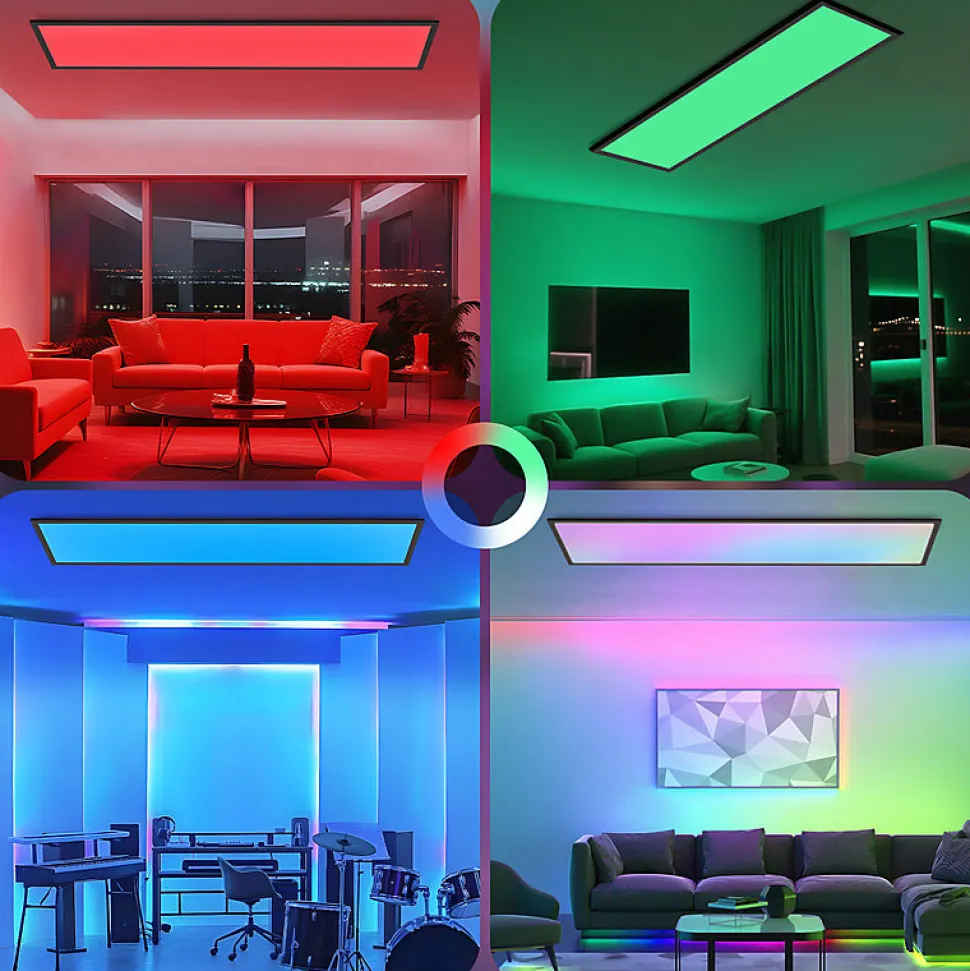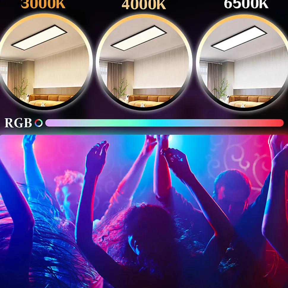 Changement de couleur RVB : Le panneau de plafond rectangulaire permet une large gamme de changements de couleurs. Les perles de lampe RVB mélangent les couleurs primaires rouge, vert et bleu, créant des dégradés de couleurs plus doux, des mouvements arc-en-ciel et des effets lumineux, améliorant la variété et le détail de l’éclairage. Mode veilleuse et minuterie de 30 minutes : Ce plafonnier RVB dispose d’un mode veilleuse qui offre une lumière douce et non éblouissante et facilite l’endormissement. La minuterie de 30 minutes éteint automatiquement la lumière après la durée définie. La télécommande vous permet de régler facilement la luminosité et la durée pour une expérience d’éclairage confortable et intelligente. Sans scintillement / Indice de rendu des couleurs élevé / Économie d’énergie : Cette grande lampe de bureau utilise une technologie de source lumineuse avancée qui réduit efficacement le scintillement et prévient la fatigue oculaire. Un IRC supérieur à 80 garantit que la source lumineuse reproduit fidèlement les couleurs réelles des objets. Plus efficace que les ampoules classiques, elle équivaut à une ampoule de 200 watts, tout en réduisant la consommation d’énergie et en offrant une lumière plus vive.Intensité variable et contrôle de la température de couleur : Le panneau LED prend en charge la gradation et la température de couleur peut être réglée entre 3 000 K et 6 500 K. La luminosité peut être ajustée de 5 % à 102 %. Grâce à la fonction mémoire, le dernier mode de commutation est automatiquement enregistré. La température de couleur peut également être modifiée rapidement via l’interrupteur mural.Conseils d’installation : En raison de la taille importante du produit, l’installation peut être complexe. Veillez à ne pas saisir les côtés courts lors de l’installation afin d’éviter toute déformation des côtés longs. Pour toute question ou tout problème lors de l’installation, n’hésitez pas à nous contacter.