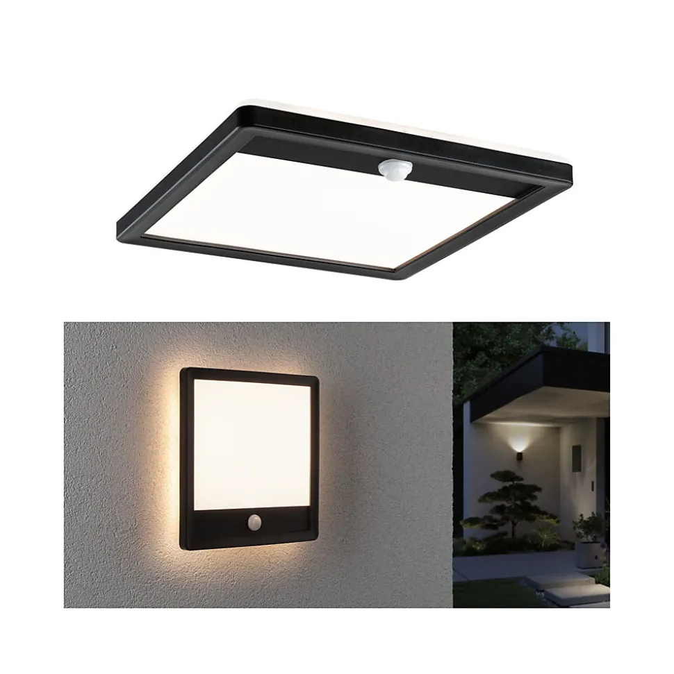Les luminaires d’extérieur situés près de la côte sont exposés à des conditions environnementales plus sévères que ceux situés à l’intérieur des terres. La teneur en sel de l’air attaque plus fortement les métaux et les matières plastiques Fabriqué en plastique de haute qualité, le panneau extérieur Lamina de dimensions 250x250mm ne se corrode pas à proximité de la mer. Avec sa surface intérieure blanche et son cadre noir, le panneau carrée diffuse un agréable éclairage blanc chaud étendu sur les murs comme au plafond. Un rétroéclairage supplémentaire crée une atmosphère agréable et met particulièrement en valeur le mur/plafond. Le détecteur de mouvement veille à ce que la lumière s’allume automatiquement dès que quelqu’un s’en approche dans l’obscurité. Les différentes fonctions du détecteur de mouvement sont réglables par l’interrupteur du luminaire.