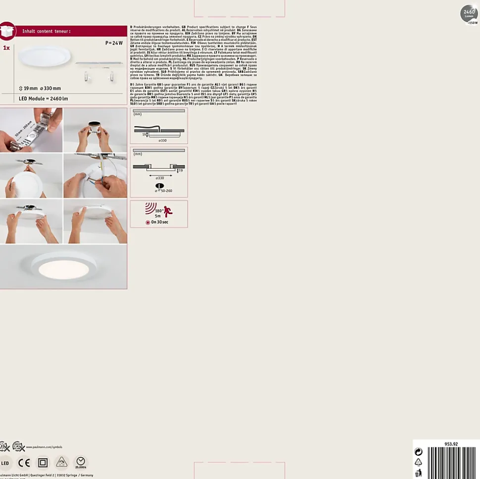 Très faible profondeur|Commutation automatique par détecteur de mouvement intégré|Éclairage de pièce uniforme sur la base de la technologie LED la plus récente|Diffusion latérale de lumière, anti-éblouissement|Température de couleur: 4000K – Blanc neutre