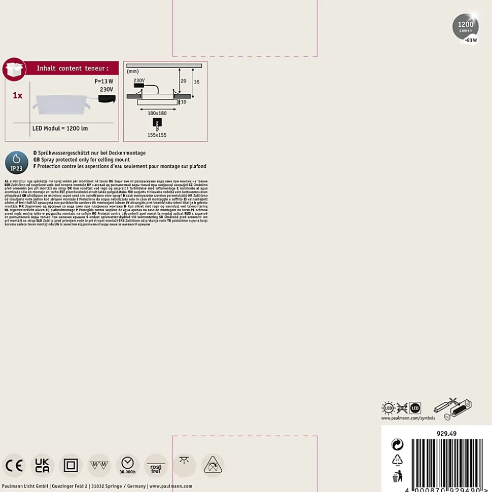 Kit complet comprenant panneau, câble de connexion et matériel de fixation|Cache en plastique satiné pour une diffusion subtile de la lumière|Faible profondeur d’encastrement de 35 mm seulement|Pour raccordement direct au secteur 230V|Ampoules LED intégrée également fournies|Température de couleur: 3000K – Blanc chaud