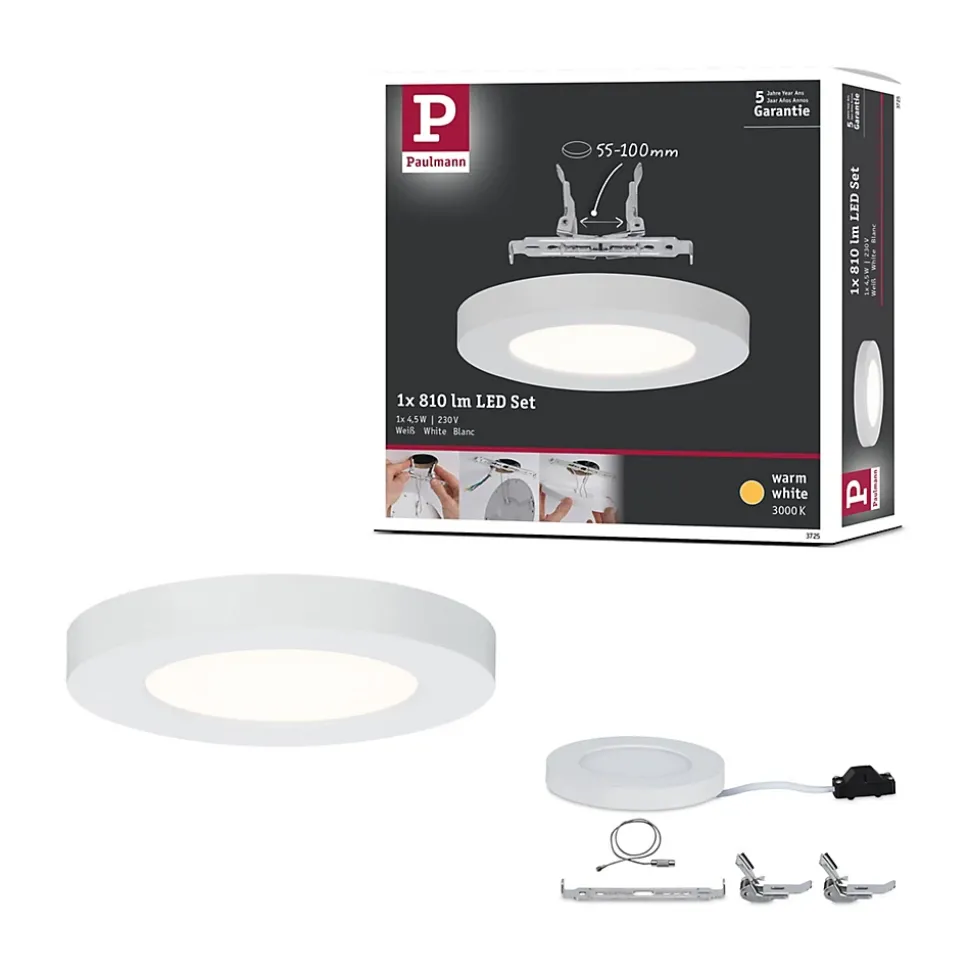 Les dimensions réduites du panneau encastré blanc, dont la capacité atteint les 4,5 watts, permettent de l’installer sur des faux plafonds à partir d’une profondeur de cavité de 20 mm. Un rail réglable avec des ressorts de retenue permet d’obtenir différents diamètres de montage.