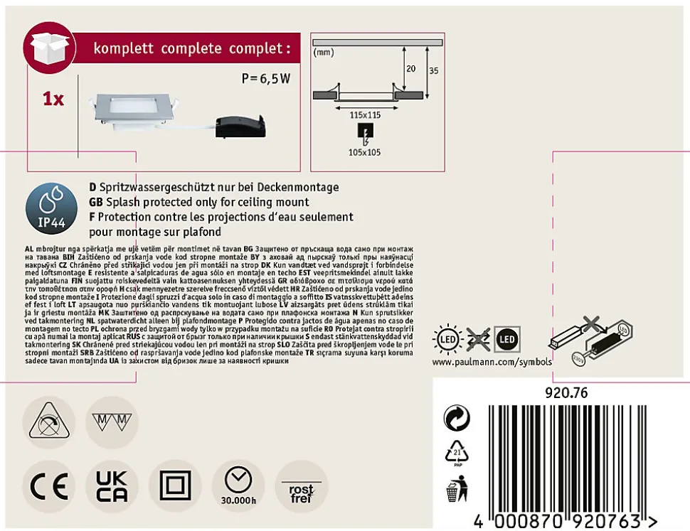 Luminaire individuel module LED inclus|La technologie LED fait économiser jusqu’à 80 % d’énergie par rapport aux ampoules à incandescence classiques.|Température de couleur: 4000K – Blanc neutre|Protection IP : IP44 – Protection contre les projections d’eau|Boîte raccord avec double clip de fixation rapide pour la connexion du câble incluse