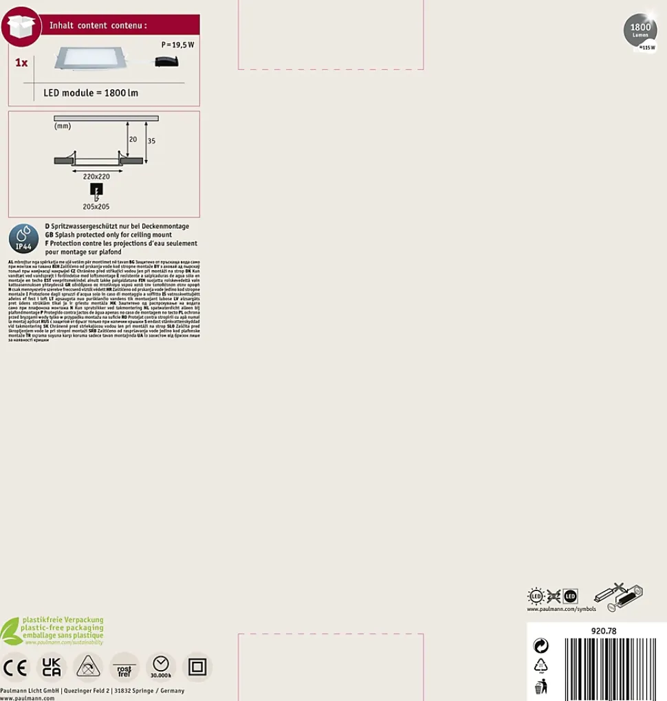 Luminaire individuel module LED inclus|La technologie LED fait économiser jusqu’à 80 % d’énergie par rapport aux ampoules à incandescence classiques.|Température de couleur: 4000K – Blanc neutre|Protection IP : IP44 – Protection contre les projections d’eau|Boîte raccord avec double clip de fixation rapide pour la connexion du câble incluse