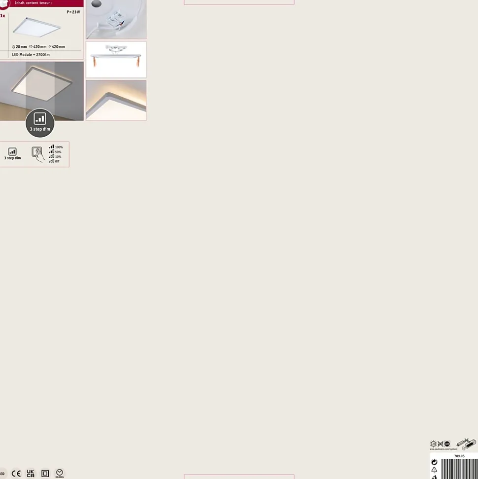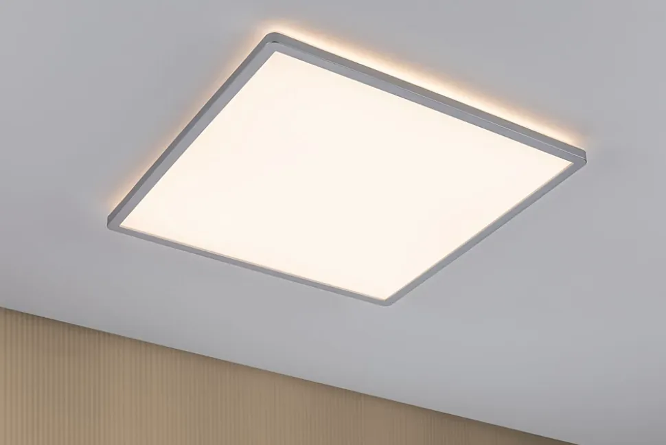 Avec une puissance de 22W, le panneau LED carrée Atria Shine de couleur Chrome mat et mesurant 420x420mm est idéal pour l’éclairage de base des salons, chambres ou cuisines. La lumière blanche et chaude du panneau permet d’éclairer la pièce de manière uniforme et étendue. Avec sa fonction intégrée gradable sur 3 niveaux, il offre trois intensités de lumière en actionnant plusieurs fois un simple commutateur traditionnel. La technologie Backlight supplémentaire crée une atmosphère de bien-être particulière et donne comme l’impression que l’éclairage du panneau flotte. Grâce aux clips de fixation rapides et à la fermeture à vis spéciale, le panneau, avec sa hauteur de montage ultraplate de 28 mm, est très facile à installer.