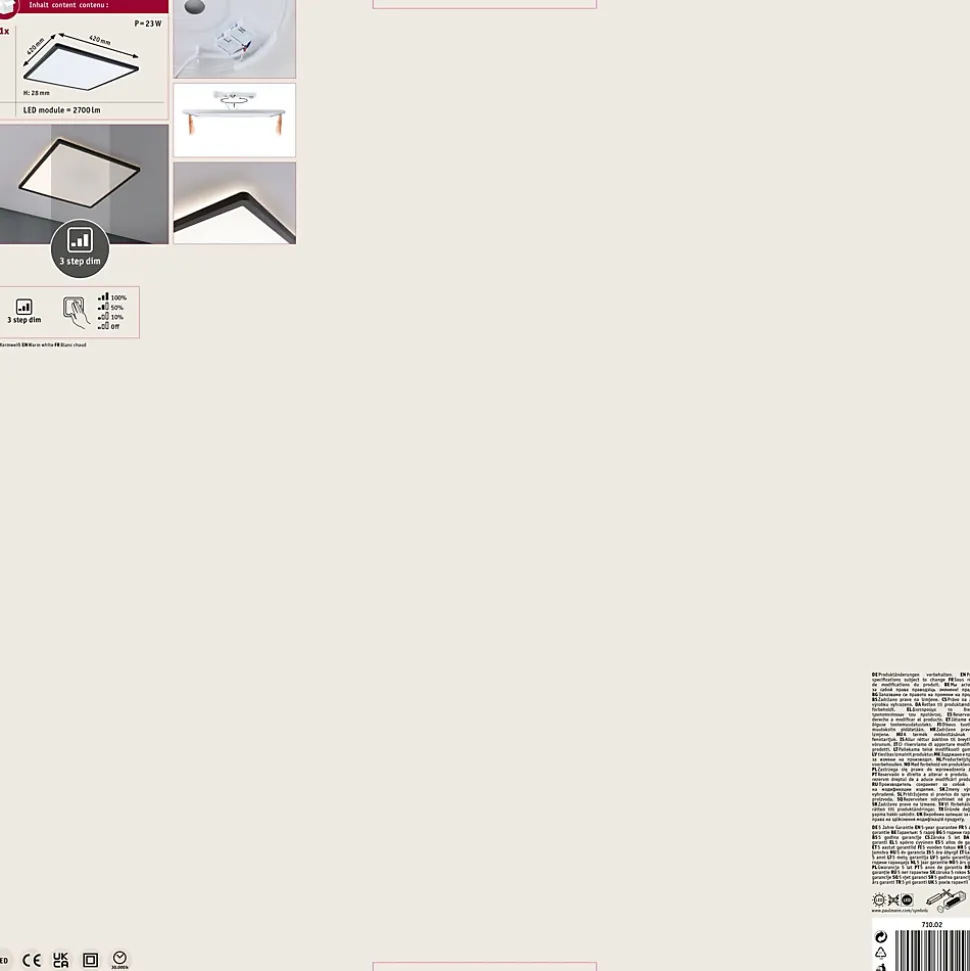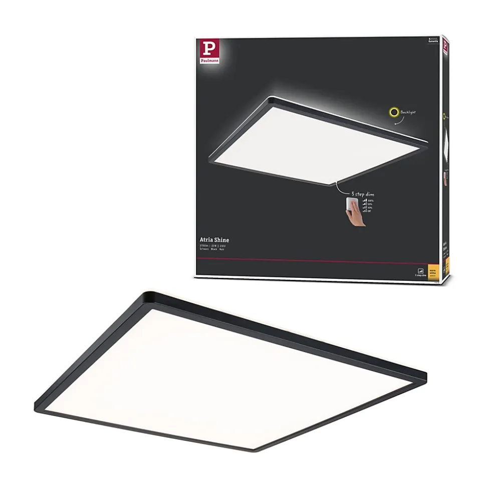 Avec une puissance de 22W, le panneau LED carrée Atria Shine de couleur Noir et mesurant 420x420mm est idéal pour l’éclairage de base des salons, chambres ou cuisines. La lumière blanche et chaude du panneau permet d’éclairer la pièce de manière uniforme et étendue. Avec sa fonction intégrée gradable sur 3 niveaux, il offre trois intensités de lumière en actionnant plusieurs fois un simple commutateur traditionnel. La technologie Backlight supplémentaire crée une atmosphère de bien-être particulière et donne comme l’impression que l’éclairage du panneau flotte. Grâce aux clips de fixation rapides et à la fermeture à vis spéciale, le panneau, avec sa hauteur de montage ultraplate de 28 mm, est très facile à installer.