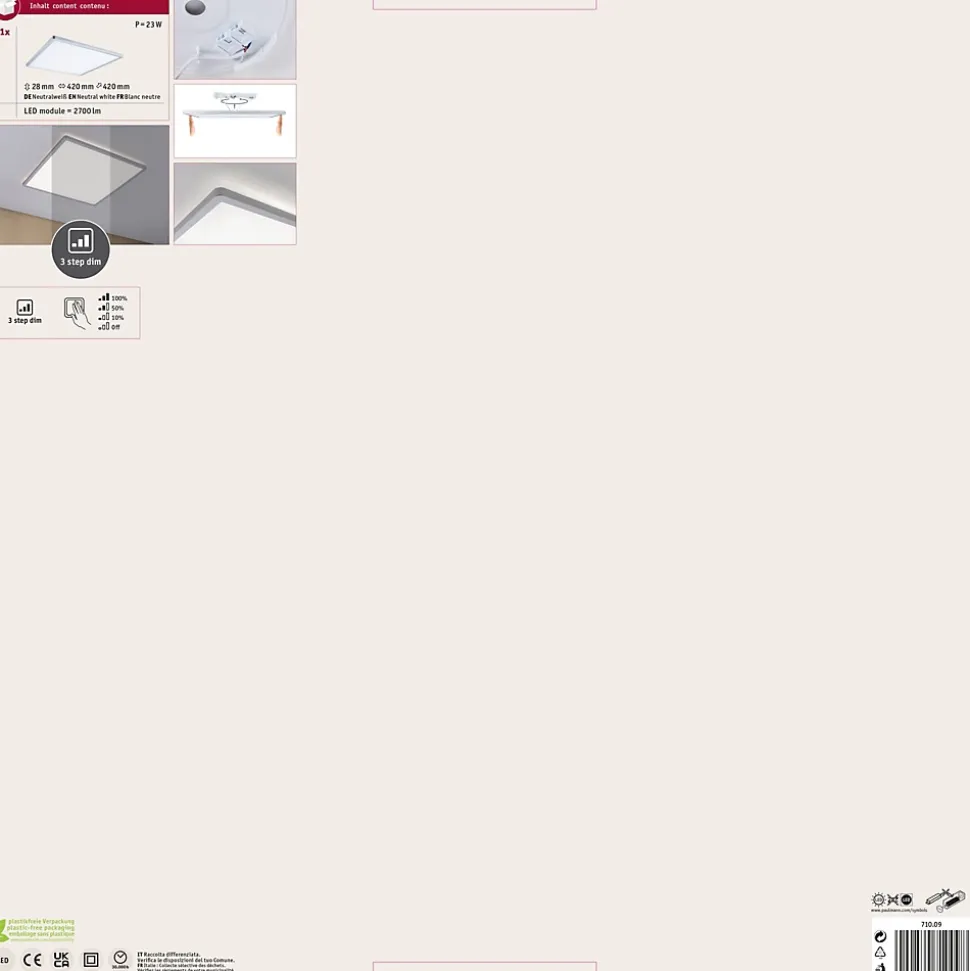 Avec une puissance de 22W, le panneau LED carrée Atria Shine de couleur Chrome mat et mesurant 420x420mm est idéal pour l’éclairage de base des salons, chambres ou cuisines. La lumière blanche et chaude du panneau permet d’éclairer la pièce de manière uniforme et étendue. Avec sa fonction intégrée gradable sur 3 niveaux, il offre trois intensités de lumière en actionnant plusieurs fois un simple commutateur traditionnel. La technologie Backlight supplémentaire crée une atmosphère de bien-être particulière et donne comme l’impression que l’éclairage du panneau flotte. Grâce aux clips de fixation rapides et à la fermeture à vis spéciale, le panneau, avec sa hauteur de montage ultraplate de 28 mm, est très facile à installer.