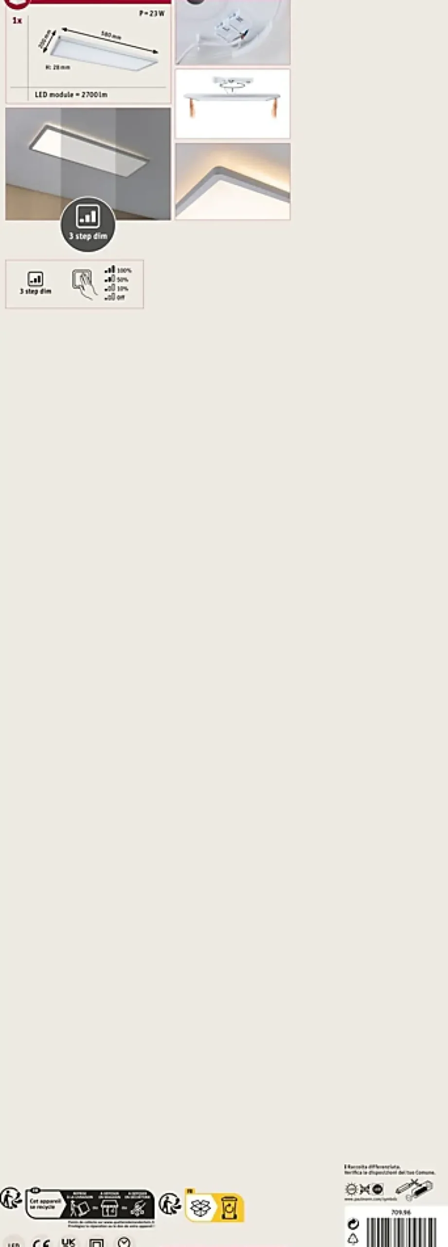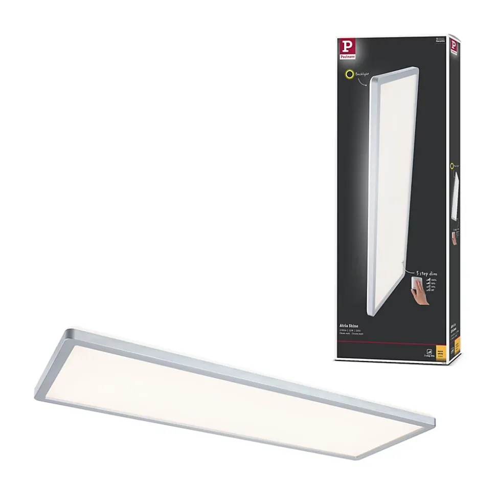 Avec une puissance de 22W, le panneau LED carrée Atria Shine de couleur Chrome mat et mesurant 580x200mm est idéal pour l’éclairage de base des salons, chambres ou cuisines. La lumière blanche et chaude du panneau permet d’éclairer la pièce de manière uniforme et étendue. Avec sa fonction intégrée gradable sur 3 niveaux, il offre trois intensités de lumière en actionnant plusieurs fois un simple commutateur traditionnel. La technologie Backlight supplémentaire crée une atmosphère de bien-être particulière et donne comme l’impression que l’éclairage du panneau flotte. Grâce aux clips de fixation rapides et à la fermeture à vis spéciale, le panneau, avec sa hauteur de montage ultraplate de 28 mm, est très facile à installer.