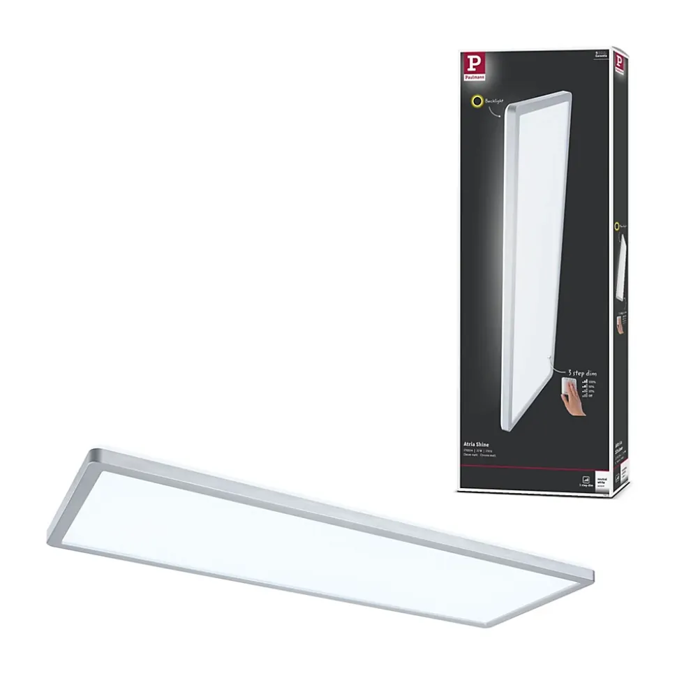 Avec une puissance de 22W, le panneau LED carrée Atria Shine de couleur Chrome mat et mesurant 580x200mm est idéal pour l’éclairage de base des salons, chambres ou cuisines. La lumière blanche et chaude du panneau permet d’éclairer la pièce de manière uniforme et étendue. Avec sa fonction intégrée gradable sur 3 niveaux, il offre trois intensités de lumière en actionnant plusieurs fois un simple commutateur traditionnel. La technologie Backlight supplémentaire crée une atmosphère de bien-être particulière et donne comme l’impression que l’éclairage du panneau flotte. Grâce aux clips de fixation rapides et à la fermeture à vis spéciale, le panneau, avec sa hauteur de montage ultraplate de 28 mm, est très facile à installer.