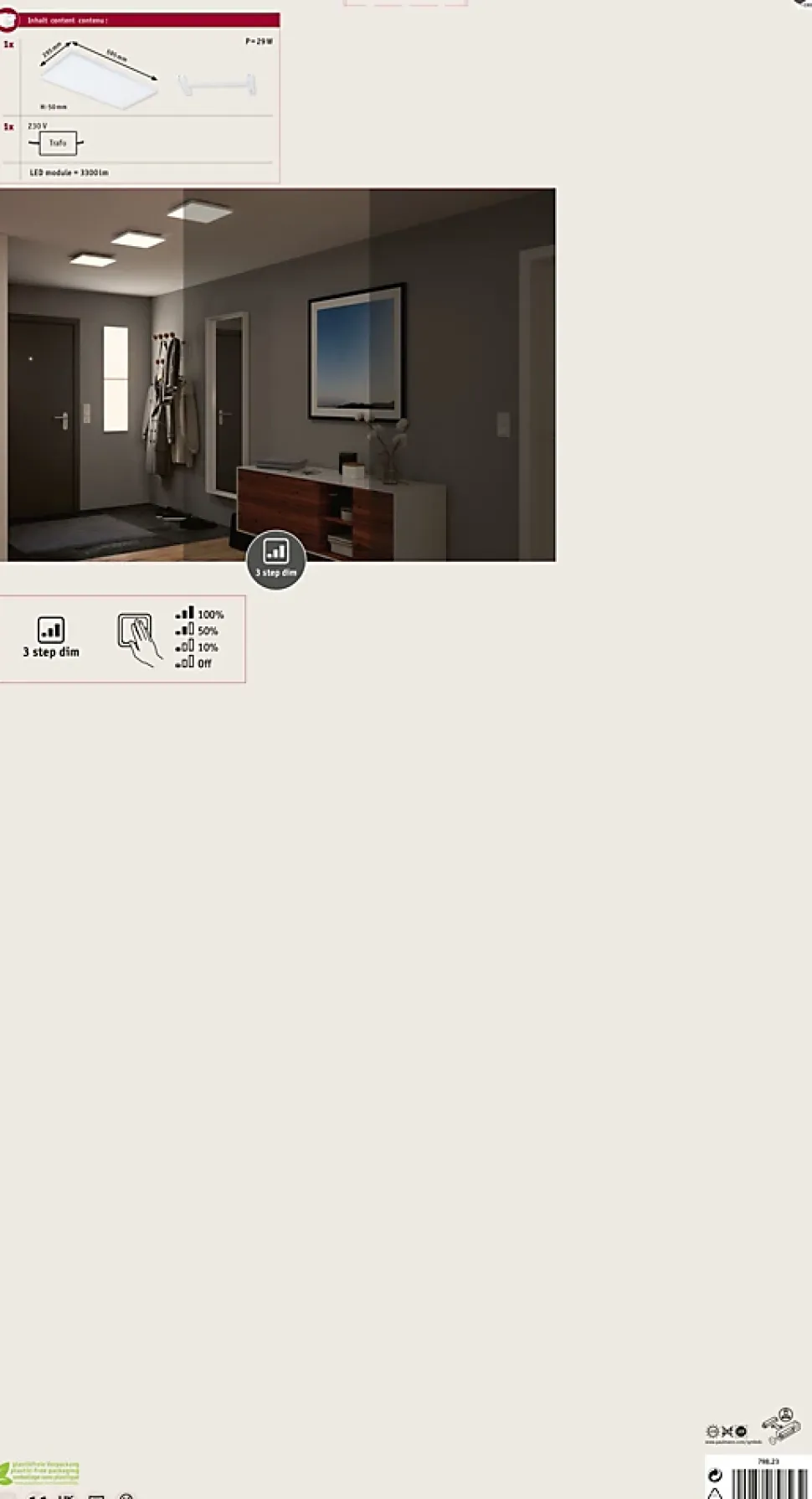 Température de couleur: 3000K – Blanc chaud|Éclairage de pièce uniforme sur la base de la technologie LED la plus récente|Design particulièrement plat|Avec ampoule LED intégrée|Un simple commutateur permet de faire varier la luminosité sur 3 niveaux|Pour raccordement direct au secteur 230V