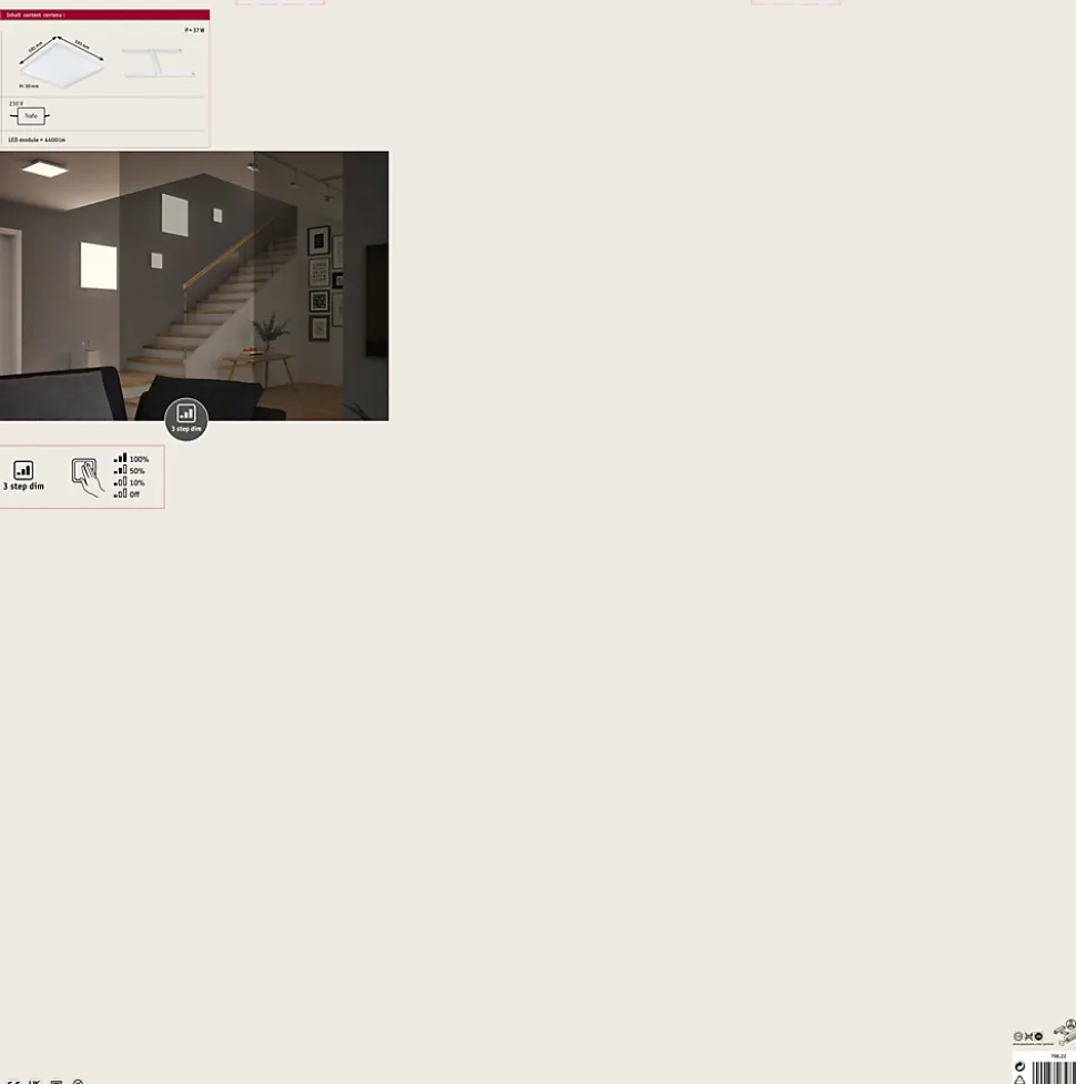 Le panneau en saillie Velora sans cadre et de dimension 295×295 mm se veut particulièrement discret par sa forme ultraplate. La surface satinée du diffuseur produit un agréable éclairage d’ambiance étendu. Le support métallique stable facilite le montage et donne l’impression que le panneau flotte en apesanteur. Avec sa fonction intégrée gradable sur 3 niveaux, il offre trois intensités de lumière en actionnant plusieurs fois un simple commutateur traditionnel.