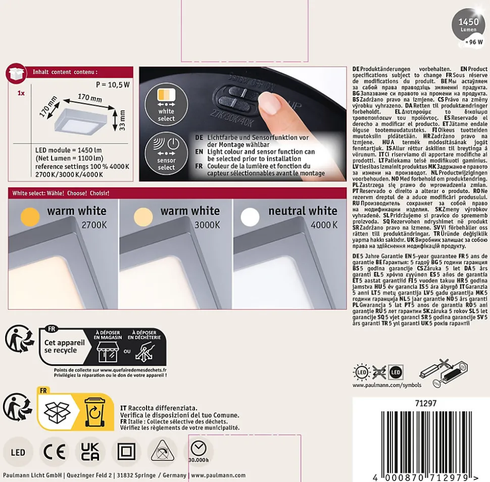 Fonction white select pour le choix individuel de la couleur de la lumière (2700 K, 3000 K, 4000 K) avant l’installation|Capteur de mouvement et crépusculaire intégré, activable via un interrupteur DIP|Lorsque le capteur est activé, la lumière ne s’allume qu’en cas de mouvement, pour une utilisation économe en énergie|Design sobre et intemporel s’adaptant à différents styles d’intérieur|Idéal pour la cuisine, le couloir ou les pièces fonctionnelles|Montage simple sans vis apparentes