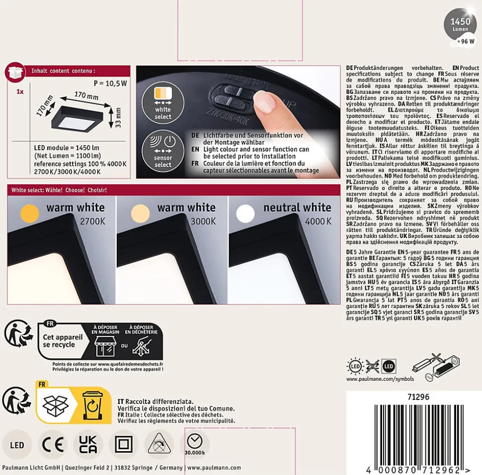 Fonction white select pour le choix individuel de la couleur de la lumière (2700 K, 3000 K, 4000 K) avant l’installation|Capteur de mouvement et crépusculaire intégré, activable via un interrupteur DIP|Lorsque le capteur est activé, la lumière ne s’allume qu’en cas de mouvement, pour une utilisation économe en énergie|Design sobre et intemporel s’adaptant à différents styles d’intérieur|Idéal pour la cuisine, le couloir ou les pièces fonctionnelles|Montage simple sans vis apparentes