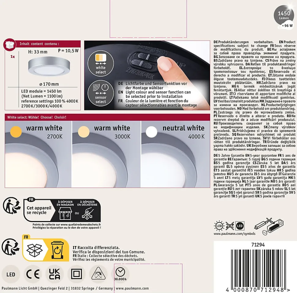 Fonction white select pour le choix individuel de la couleur de la lumière (2700 K, 3000 K, 4000 K) avant l’installation|Capteur de mouvement et crépusculaire intégré, activable via un interrupteur DIP|Lorsque le capteur est activé, la lumière ne s’allume qu’en cas de mouvement, pour une utilisation économe en énergie|Design sobre et intemporel s’adaptant à différents styles d’intérieur|Idéal pour la cuisine, le couloir ou les pièces fonctionnelles|Montage simple sans vis apparentes