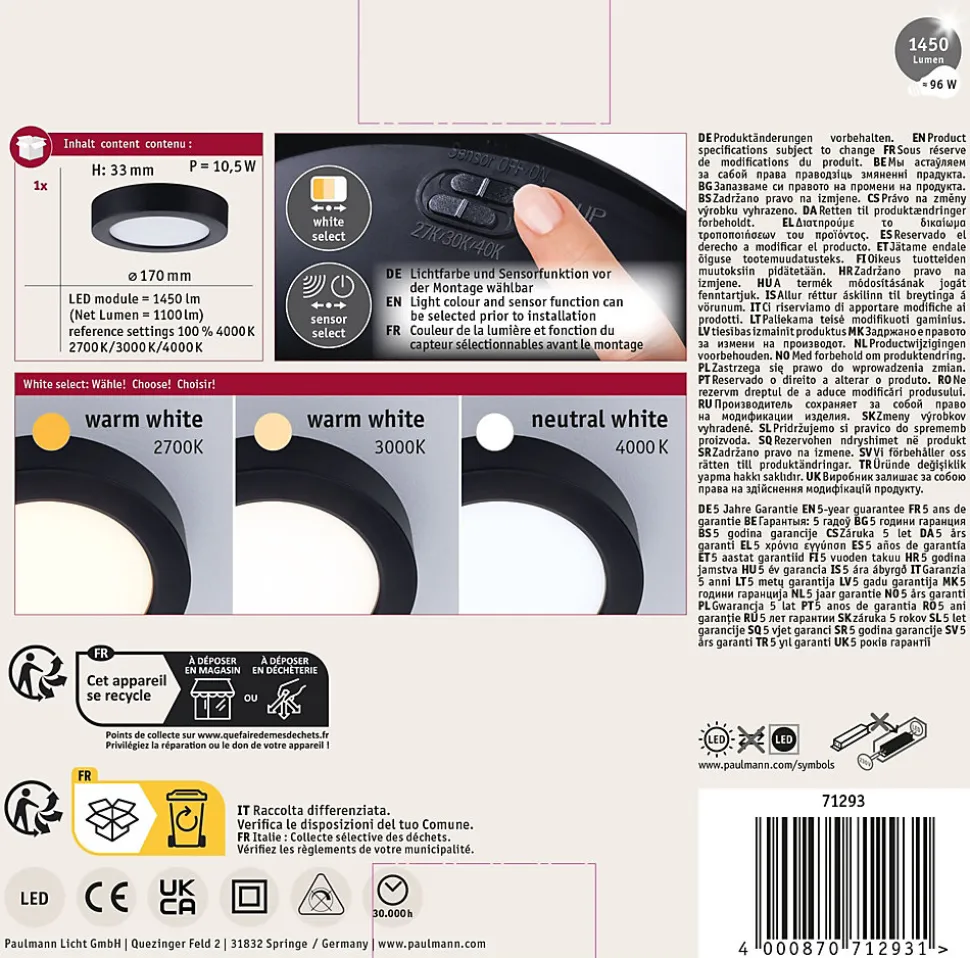Fonction white select pour le choix individuel de la couleur de la lumière (2700 K, 3000 K, 4000 K) avant l’installation|Capteur de mouvement et crépusculaire intégré, activable via un interrupteur DIP|Lorsque le capteur est activé, la lumière ne s’allume qu’en cas de mouvement, pour une utilisation économe en énergie|Design sobre et intemporel s’adaptant à différents styles d’intérieur|Idéal pour la cuisine, le couloir ou les pièces fonctionnelles|Montage simple sans vis apparentes