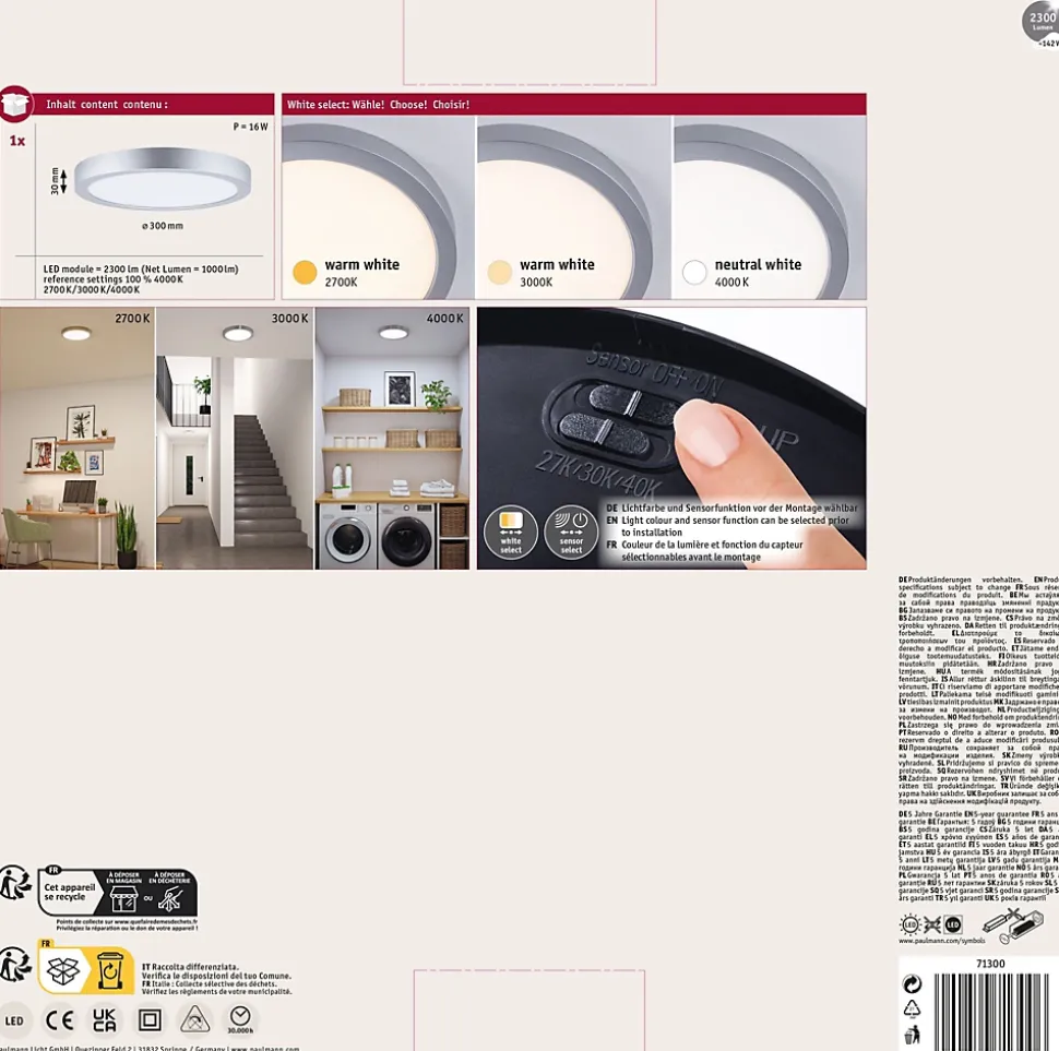 Fonction white select pour le choix individuel de la couleur de la lumière (2700 K, 3000 K, 4000 K) avant l’installation|Capteur de mouvement et crépusculaire intégré, activable via un interrupteur DIP|Lorsque le capteur est activé, la lumière ne s’allume qu’en cas de mouvement, pour une utilisation économe en énergie|Design sobre et intemporel s’adaptant à différents styles d’intérieur|Idéal pour la cuisine, le couloir ou les pièces fonctionnelles|Montage simple sans vis apparentes