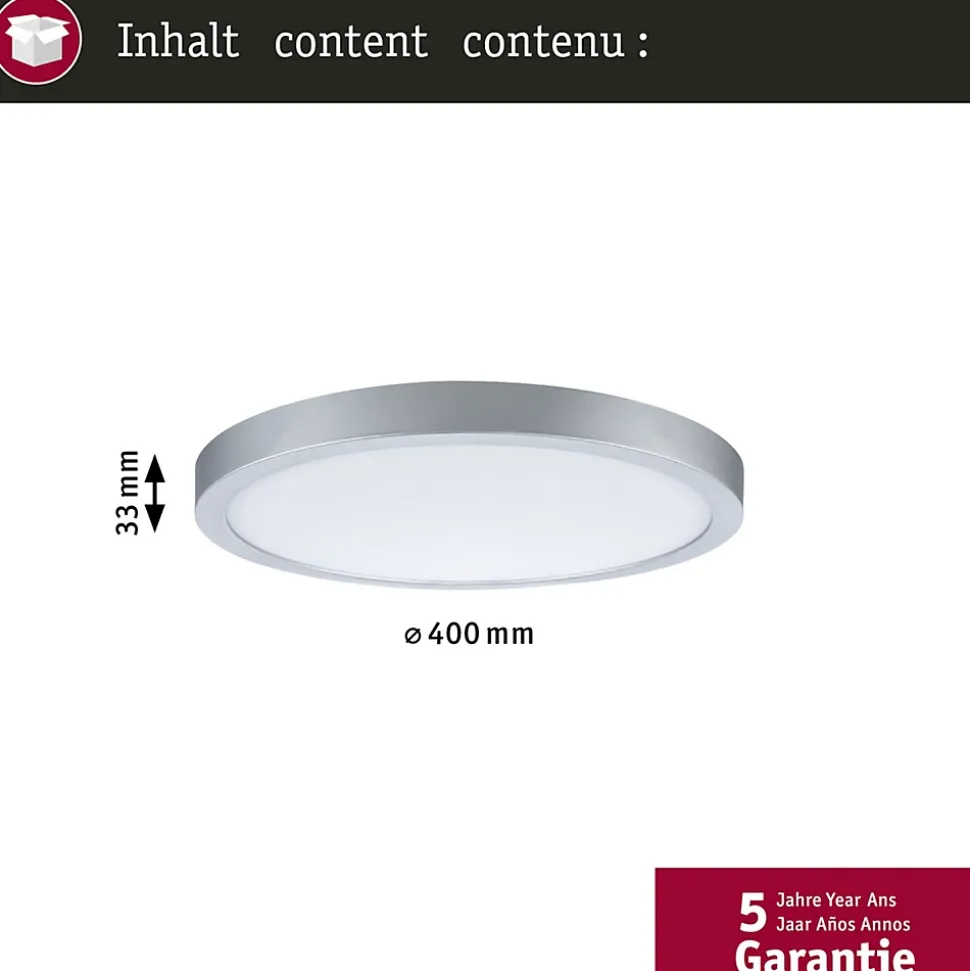 Plus de confort. Plus de sécurité. Plus de possibilités ! Le panneau Abia 2 met fin aux compromis et apporte une solution d’éclairage fonctionnelle dans chaque pièce. Un interrupteur Dip permet d’activer ou de désactiver le capteur de mouvement intégré commandé par crépuscule avant le montage. Le panneau offre ainsi une solution optimale aux différentes exigences des espaces fonctionnels, des cuisines ou des couloirs. Le capteur réagit de manière fiable aux mouvements et assure un confort et une sécurité accrus grâce à la commande automatique de l’éclairage. Lorsque le capteur est activé, la lumière ne s’allume que lorsqu’elle est nécessaire, ce qui permet une utilisation efficace de l’énergie. Lorsque le capteur est désactivé, le panneau LED peut être allumé et éteint confortablement comme d’habitude à l’aide de l’interrupteur mural existant. L’interrupteur Dip White Select, qui permet de régler la température de Farbe avant le montage, offre également une flexibilité maximale. Selon les besoins, il est possible de choisir entre deux tons de blanc chaud et un ton de blanc neutre. Le panneau d’un diamètre de 400mm est facile à monter et s’intègre parfaitement dans tout environnement résidentiel, fonctionnel ou de travail grâce à son design intemporel en Chrome mat.