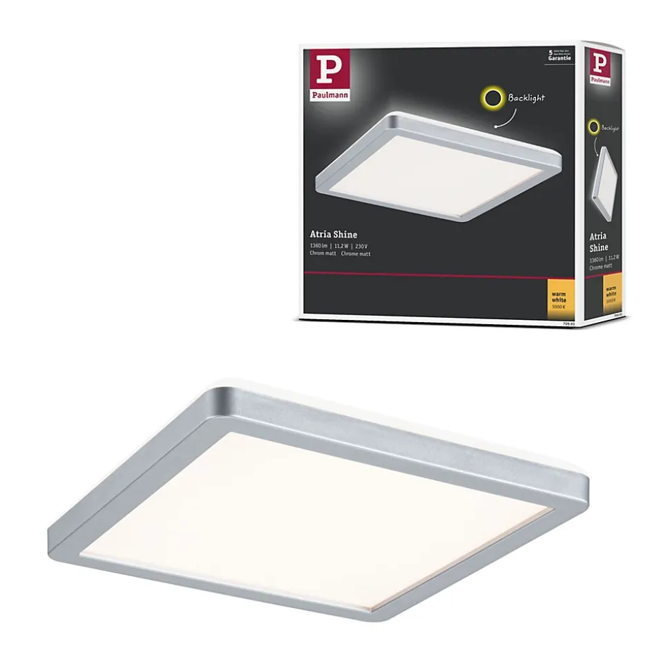 Avec une puissance de 11,2W, le panneau LED carrée Atria Shine de couleur Chrome mat et mesurant 190x190mm est idéal pour l’éclairage de base des salons, chambres ou cuisines. La lumière blanche et chaude du panneau permet d’éclairer la pièce de manière uniforme et étendue. La technologie Backlight supplémentaire crée une atmosphère de bien-être particulière et donne comme l’impression que l’éclairage du panneau flotte. Grâce aux clips de fixation rapides et à la fermeture à vis spéciale, le panneau, avec sa hauteur de montage ultraplate de 28 mm, est très facile à installer.