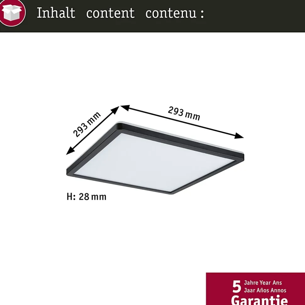 Avec une puissance de 16W, le panneau LED carrée Atria Shine de couleur Noir et mesurant 293x293mm est idéal pour l’éclairage de base des salons, chambres ou cuisines. La lumière blanche et chaude du panneau permet d’éclairer la pièce de manière uniforme et étendue. La technologie Backlight supplémentaire crée une atmosphère de bien-être particulière et donne comme l’impression que l’éclairage du panneau flotte. Grâce aux clips de fixation rapides et à la fermeture à vis spéciale, le panneau, avec sa hauteur de montage ultraplate de 28 mm, est très facile à installer.