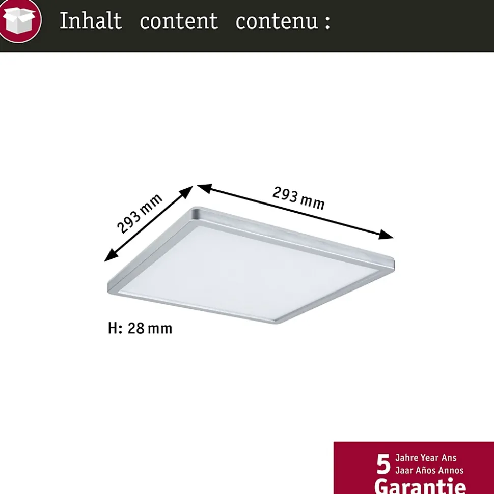 Avec une puissance de 16W, le panneau LED carrée Atria Shine de couleur Chrome mat et mesurant 293x293mm est idéal pour l’éclairage de base des salons, chambres ou cuisines. La lumière du panneau permet d’éclairer la pièce de manière uniforme et étendue. La technologie Backlight supplémentaire crée une atmosphère de bien-être particulière et donne comme l’impression que l’éclairage du panneau flotte. Grâce aux clips de fixation rapides et à la fermeture à vis spéciale, le panneau, avec sa hauteur de montage ultraplate de 28 mm, est très facile à installer.
