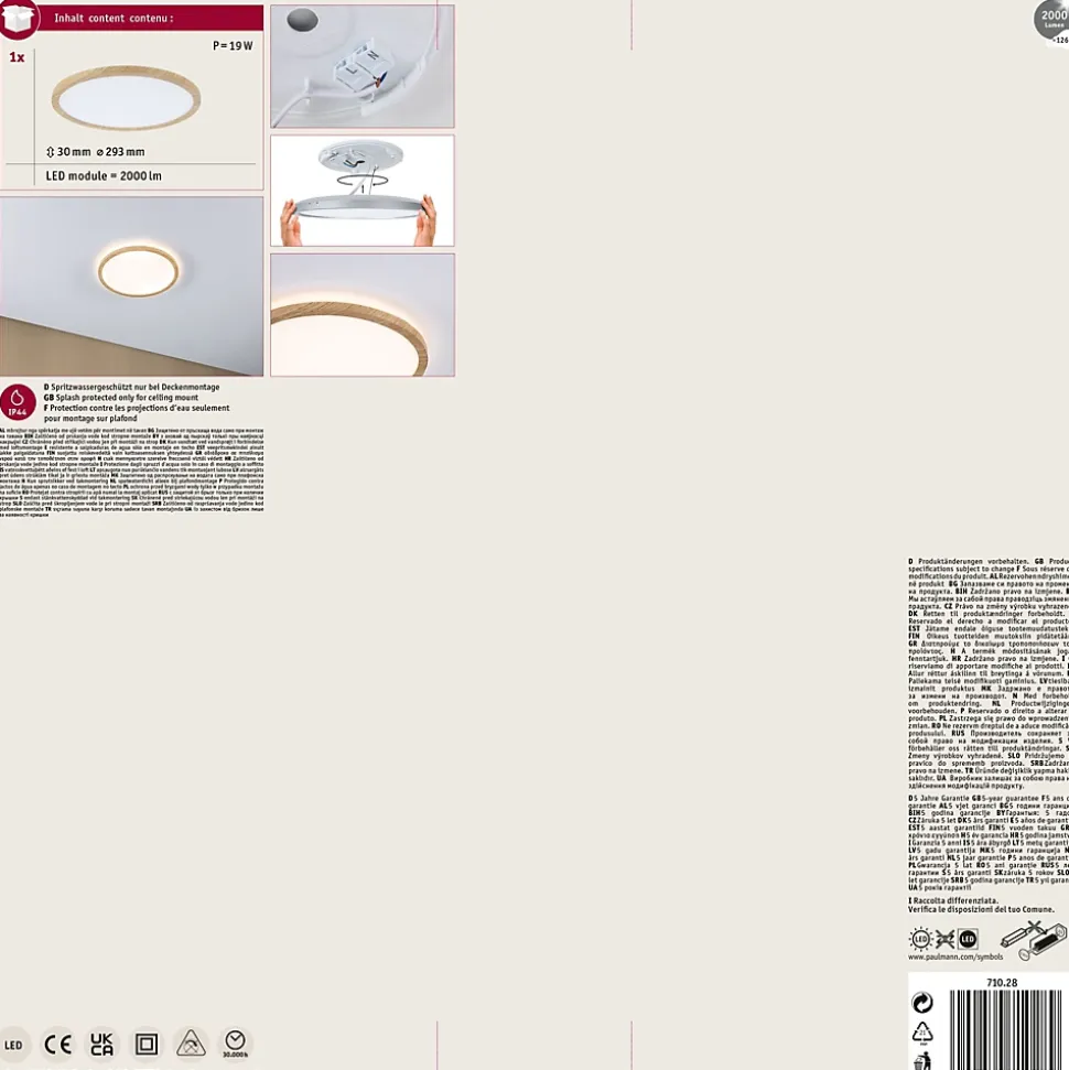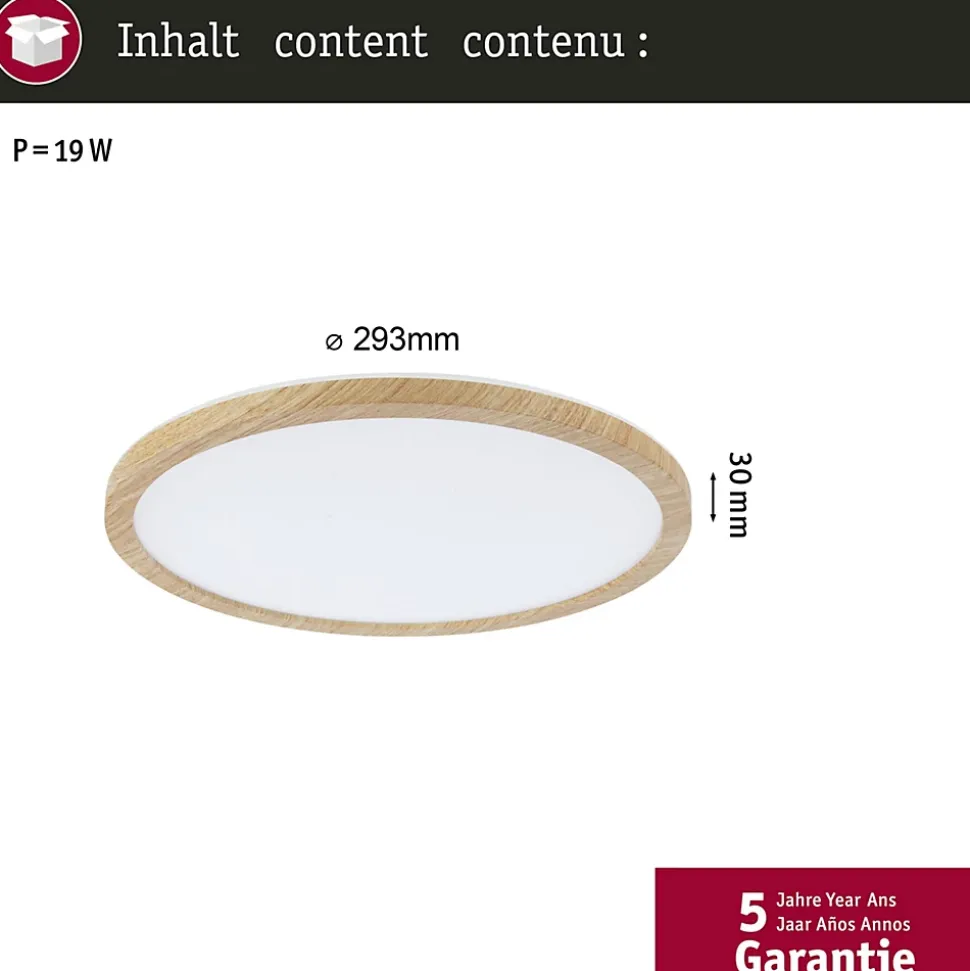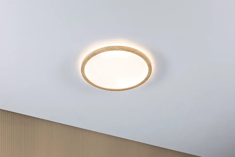 Avec une puissance de 16W, le panneau LED rond Atria Shine mesurant 293 mm est idéal pour l’éclairage de base des salons, chambres ou cuisines. Le design unique du cadre à l’aspect bois confère au panneau un aspect naturel et confortable. La lumière blanche et chaude du panneau permet d’éclairer la pièce de manière uniforme et étendue. La technologie lumineuse supplémentaire Backlight donne l’impression que le panneau lumineux flotte. Grâce au clip de fixation rapide et au montage de la platine, le panneau est très facile à installer avec sa hauteur de montage ultra-plate de 28 mm.