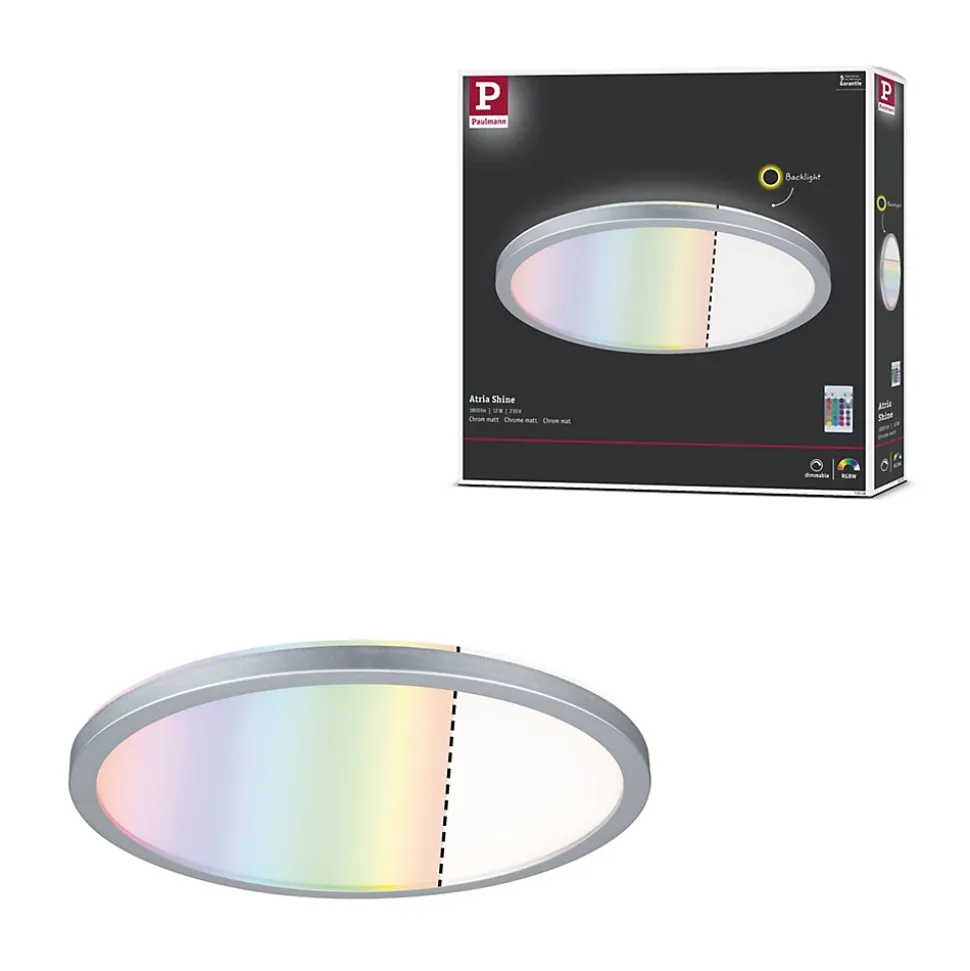 Avec une puissance de 12W, le panneau LED ronde Atria Shine de couleur Chrome mat et mesurant 293mm est idéal pour l’éclairage de base des salons, chambres ou cuisines. Le panneau à changement de couleur multicolore RGBW permet un éclairage étendu et uniforme de la pièce. Avec la télécommande incluse, vous pouvez contrôler les températures de couleur entre blanc chaud véritable, lumière colorée et divers effets, selon votre humeur. La technologie Backlight supplémentaire crée une atmosphère de bien-être particulière et donne comme l’impression que l’éclairage du panneau flotte. Grâce aux clips de fixation rapides et à la fermeture à vis spéciale, le panneau, avec sa hauteur de montage ultraplate de 28 mm, est très facile à installer.