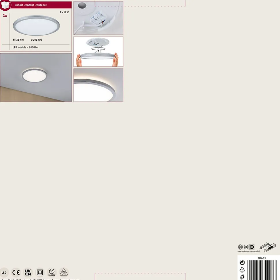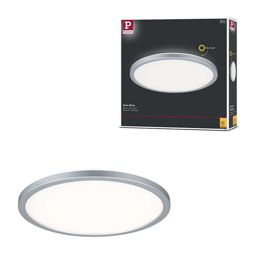 Avec une puissance de 16W, le panneau LED ronde Atria Shine de couleur Chrome mat et mesurant 293mm est idéal pour l’éclairage de base des salons, chambres ou cuisines. La lumière blanche et chaude du panneau permet d’éclairer la pièce de manière uniforme et étendue. La technologie Backlight supplémentaire crée une atmosphère de bien-être particulière et donne comme l’impression que l’éclairage du panneau flotte. Grâce aux clips de fixation rapides et à la fermeture à vis spéciale, le panneau, avec sa hauteur de montage ultraplate de 28 mm, est très facile à installer.
