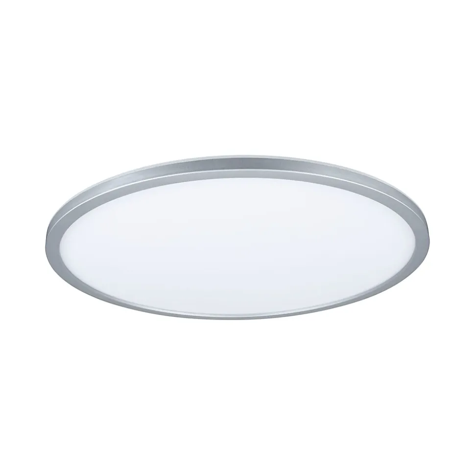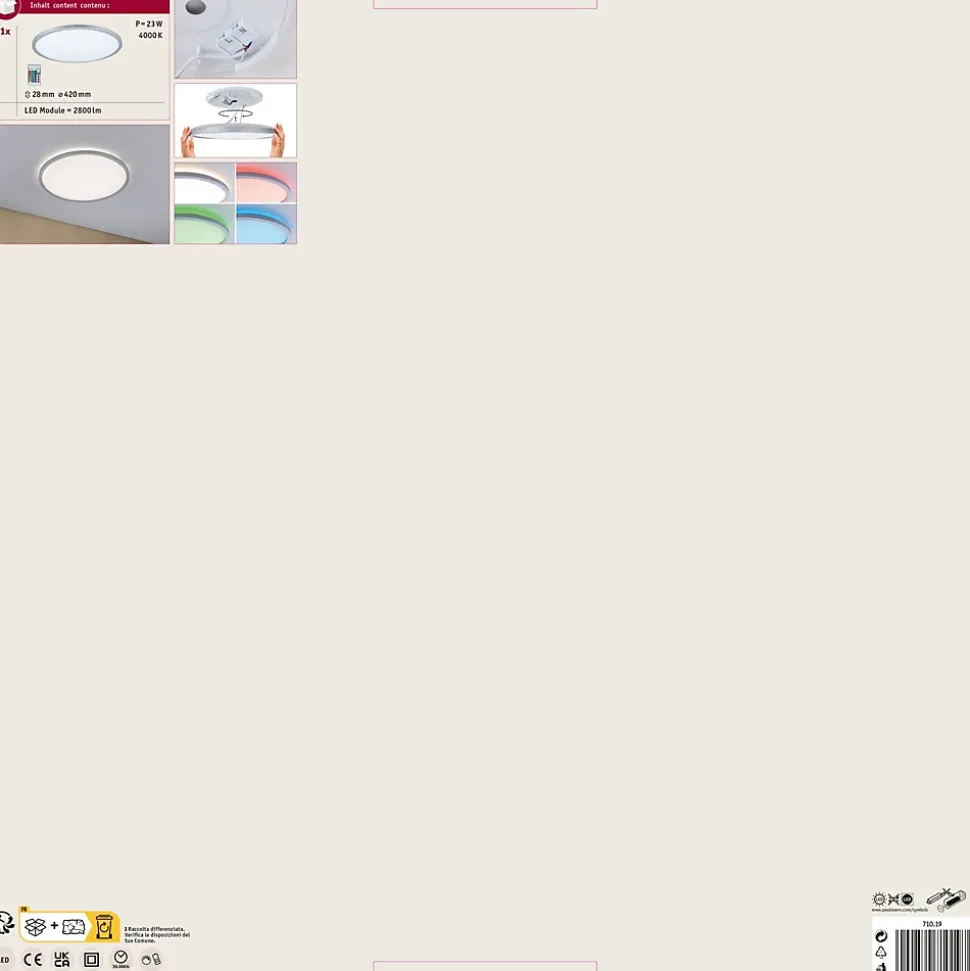 Avec une puissance de 20W, le panneau LED ronde Atria Shine de couleur Chrome mat et mesurant 420mm est idéal pour l’éclairage de base des salons, chambres ou cuisines. Le panneau à changement de couleur multicolore RGBW permet un éclairage étendu et uniforme de la pièce. Avec la télécommande incluse, vous pouvez contrôler les températures de couleur entre blanc chaud véritable, lumière colorée et divers effets, selon votre humeur. La technologie Backlight supplémentaire crée une atmosphère de bien-être particulière et donne comme l’impression que l’éclairage du panneau flotte. Grâce aux clips de fixation rapides et à la fermeture à vis spéciale, le panneau, avec sa hauteur de montage ultraplate de 28 mm, est très facile à installer.