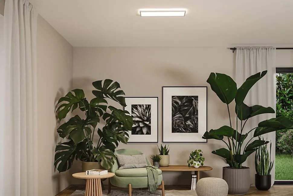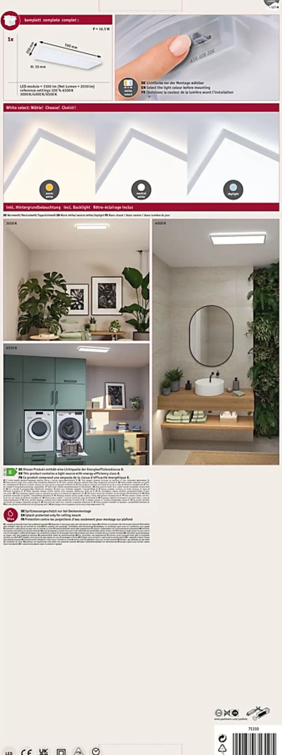 Panneau avec classe d’efficacité énergétique B (Module LED)|Fonction White Select pour un choix individuel de la température de couleur (3000 K, 4000 K, 6500 K)|Idéal pour un éclairage particulièrement lumineux|Protection IP44 contre les projections d’eau pour les salles de bains et autres pièces similaires|Aspect flottant grâce à la technologie Backlight|Pose au mur ou au plafond|Design plat : Hauteur de montage de seulement 35 mm|Montage facile grâce à la fermeture rotative et au clip de fixation rapide