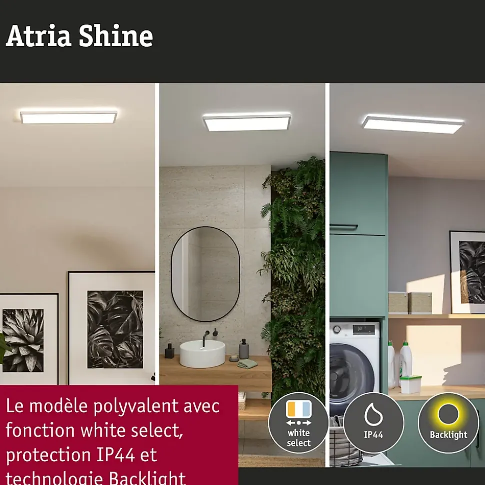 Avec sa haute efficacité énergétique et sa grande variété de températures de couleur, le panneau LED rectangulaire Atria Shine en blanc est vraiment polyvalent ! Grâce à l’amélioration de l’efficacité énergétique du module LED, qui est passée de la classe F à la classe B, le nouveau panneau Atria Shine offre une solution d’éclairage innovante et évolutive. La consommation énergétique nettement réduite n’est pas seulement bonne pour l’environnement, mais aussi pour le porte-monnaie grâce à la diminution des coûts énergétiques. Avant le montage, l’interrupteur White Select permet de choisir entre trois températures de couleur : blanc chaud (3000K), blanc neutre (4000K) ou blanc lumière du jour (6500K). Qu’il s’agisse d’un espace de vie confortable, de l’éclairage fonctionnel d’une cuisine ou d’un bureau bien éclairé, il existe une atmosphère lumineuse adaptée à chaque pièce. Sur le plan visuel, les luminaires convainquent par leur aspect presque flottant, grâce à la technique de rétroéclairage du plus bel effet. Grâce au design sobre du panneau LED de 560×200 mm, il s’intègre parfaitement dans les styles d’aménagement individuels et peut même être utilisé dans la salle de bain grâce à la protection IP44. Le montage au mur ou au plafond est simple grâce à la fermeture rotative et à la pince rapide.