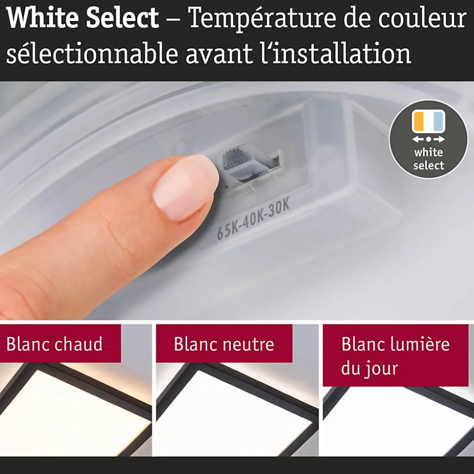 Panneau avec classe d’efficacité énergétique B (Module LED)|Fonction White Select pour un choix individuel de la température de couleur (3000 K, 4000 K, 6500 K)|Idéal pour un éclairage particulièrement lumineux|Protection IP44 contre les projections d’eau pour les salles de bains et autres pièces similaires|Aspect flottant grâce à la technologie Backlight|Pose au mur ou au plafond|Design plat : Hauteur de montage de seulement 35 mm|Montage facile grâce à la fermeture rotative et au clip de fixation rapide