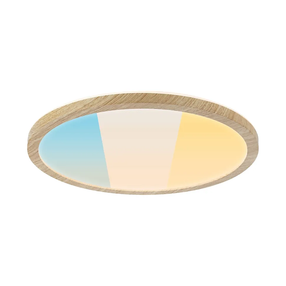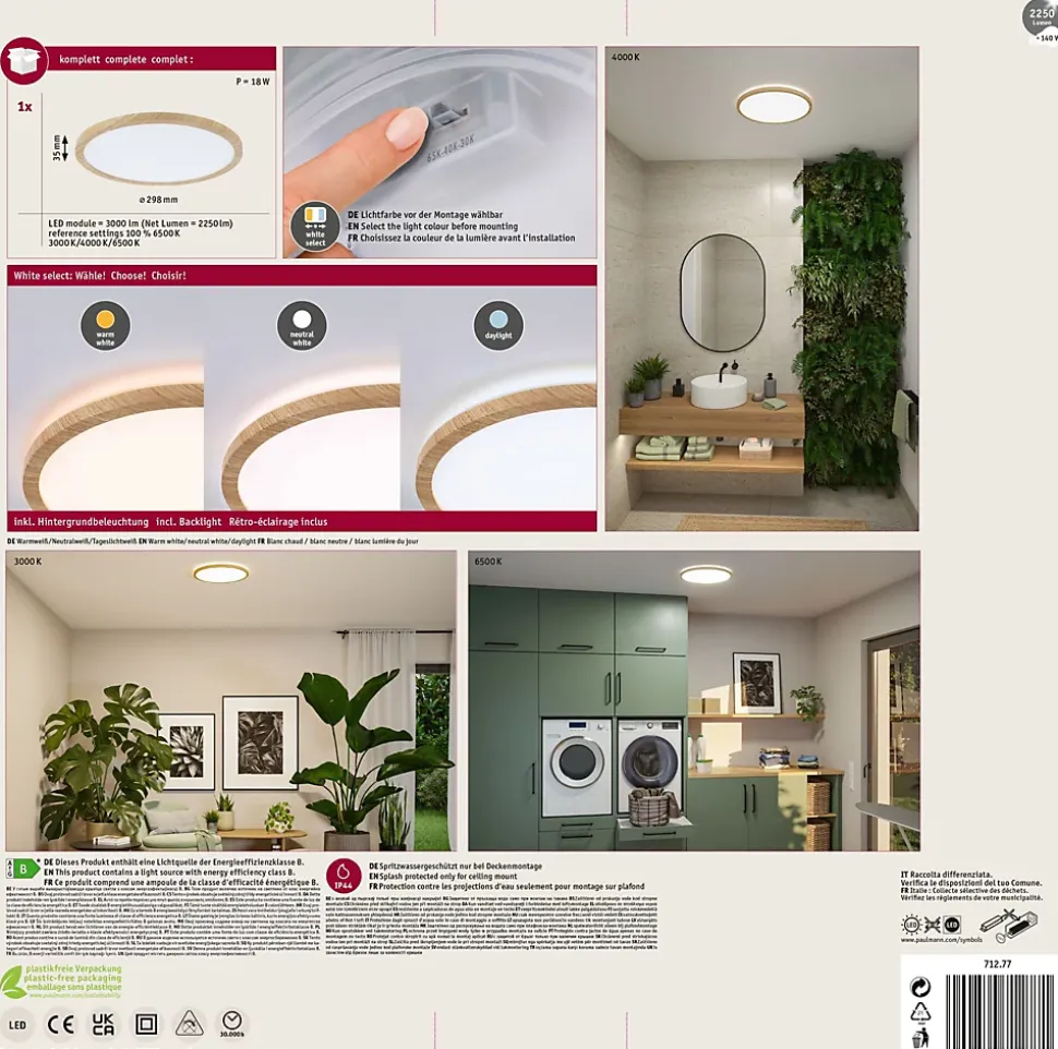 Le rondpanneau Atria Shine en Esthétique bois est vraiment polyvalent grâce à sa grande performance énergétique et sa variété de couleurs de feu ! Avec sa performance énergétique améliorée, passée de la classe E à la classe B, le nouveau panneau Atria Shine offre une solution d’éclairage innovante et durable. Cette réduction significative de la consommation d’énergie est non seulement bénéfique pour l’environnement, mais aussi pour le porte-monnaie. Avant l’installation, l’interrupteur White Select permet de choisir entre trois températures de couleur : blanc chaud (3000 K), blanc neutre (4000 K) ou blanc lumière du jour (6500 K). Que ce soit pour un espace de vie confortable, l’éclairage fonctionnel d’une cuisine ou un bureau bien éclairé, il existe une atmosphère lumineuse adaptée à chaque pièce. Avec une luminosité impressionnante de 14,8W, le panneau Atria Shine est également idéal pour les applications exigeantes qui nécessitent beaucoup de lumière. L’aspect visuel du luminaire se distingue par son apparence presque flottante, obtenue grâce à la technologie Backlight efficace. Le design attrayant du cadre à l’esthétique bois donne au panneau un look naturel et confortable. Grâce à son design sobre, il s’intègre parfaitement dans différents styles d’aménagement et peut même être utilisé dans la salle de bains grâce à sa protection IP44. Le montage au mur ou au plafond est simple grâce à la fermeture rotative et au clip de fixation rapide.
