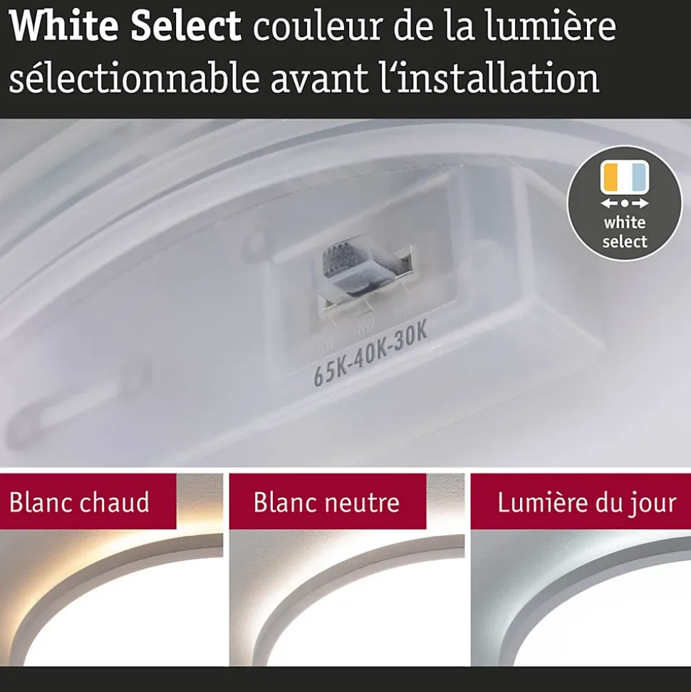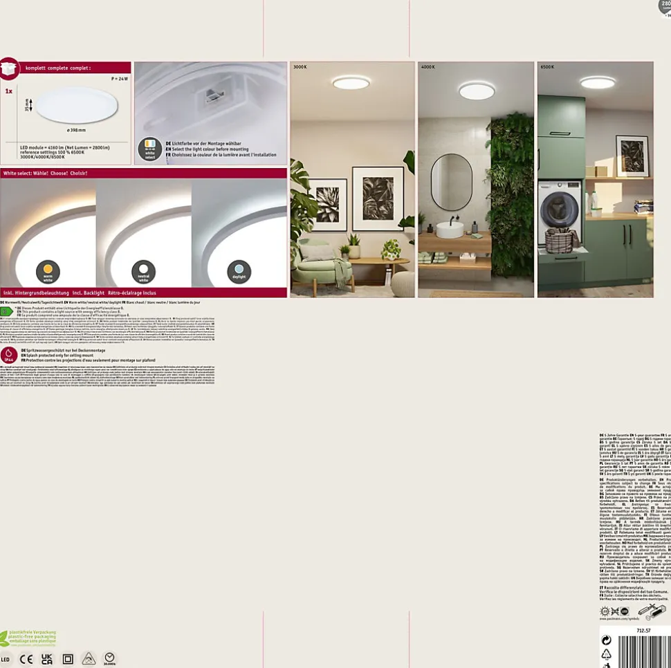 Panneau avec classe d’efficacité énergétique B (Module LED)|Fonction White Select pour un choix individuel de la température de couleur (3000 K, 4000 K, 6500 K)|Idéal pour un éclairage particulièrement lumineux|Protection IP44 contre les projections d’eau pour les salles de bains et autres pièces similaires|Aspect flottant grâce à la technologie Backlight|Pose au mur ou au plafond|Design plat : Hauteur de montage de seulement 35 mm|Montage facile grâce à la fermeture rotative et au clip de fixation rapide