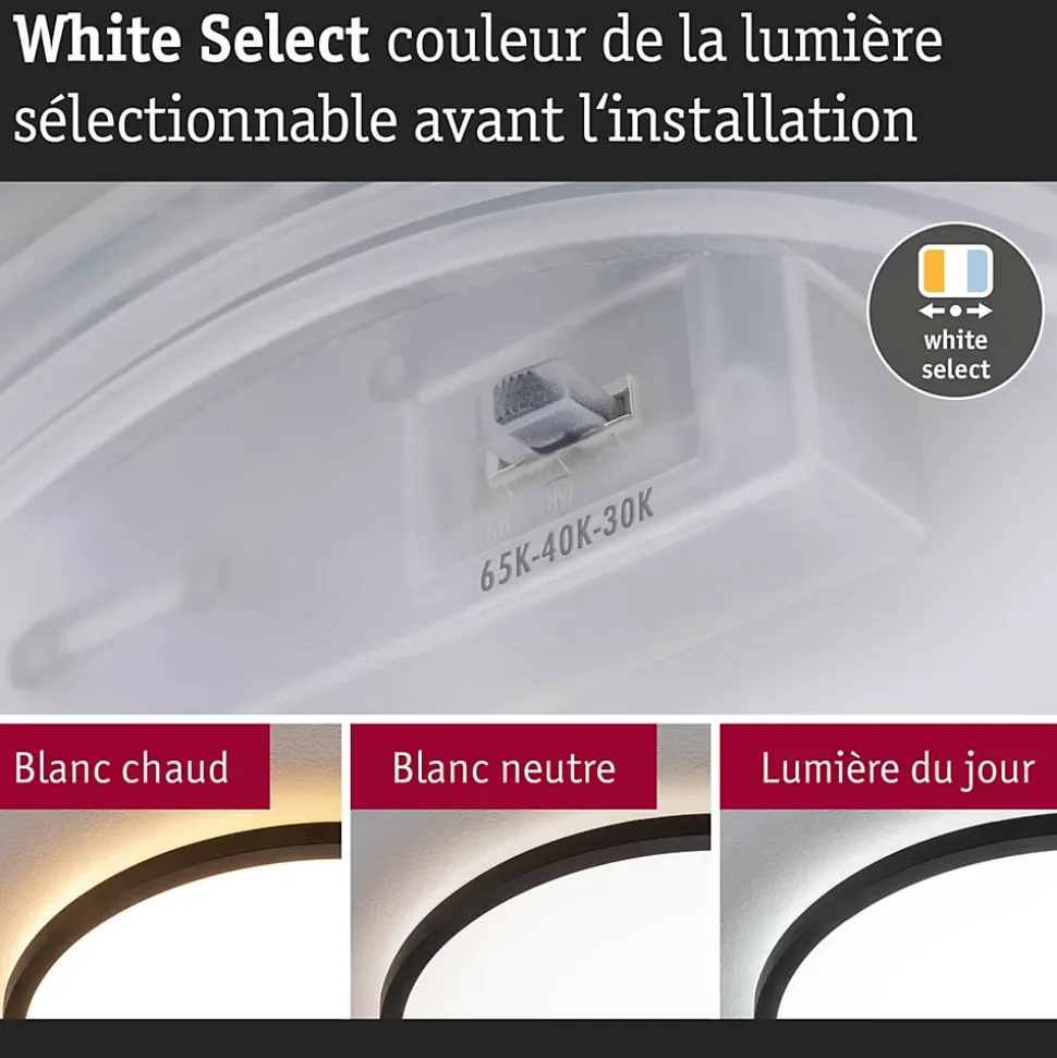 Panneau avec classe d’efficacité énergétique B (Module LED)|Fonction White Select pour un choix individuel de la température de couleur (3000 K, 4000 K, 6500 K)|Idéal pour un éclairage particulièrement lumineux|Protection IP44 contre les projections d’eau pour les salles de bains et autres pièces similaires|Aspect flottant grâce à la technologie Backlight|Pose au mur ou au plafond|Design plat : Hauteur de montage de seulement 35 mm|Montage facile grâce à la fermeture rotative et au clip de fixation rapide