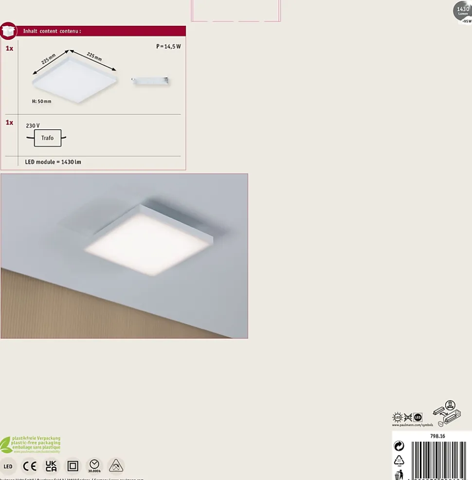 Design particulièrement plat|Température de couleur: 3000K – Blanc chaud|Éclairage de pièce uniforme sur la base de la technologie LED la plus récente|Avec ampoule LED intégrée|Pour raccordement direct au secteur 230V