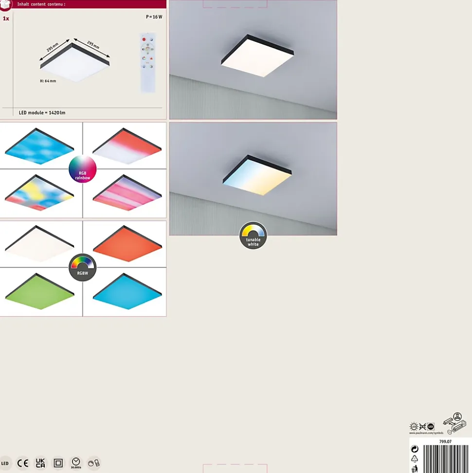 Un éclairage de base puissant aux effets lumineux uniques|16 animations Rainbow prédéfinies|Télécommande IR multifonctionnelle incluse|Design sans cadre élégant|Fonction Veilleuse|Éclairage étendu|Éclairage de pièce uniforme sur la base de la technologie LED la plus récente|Intensité variable