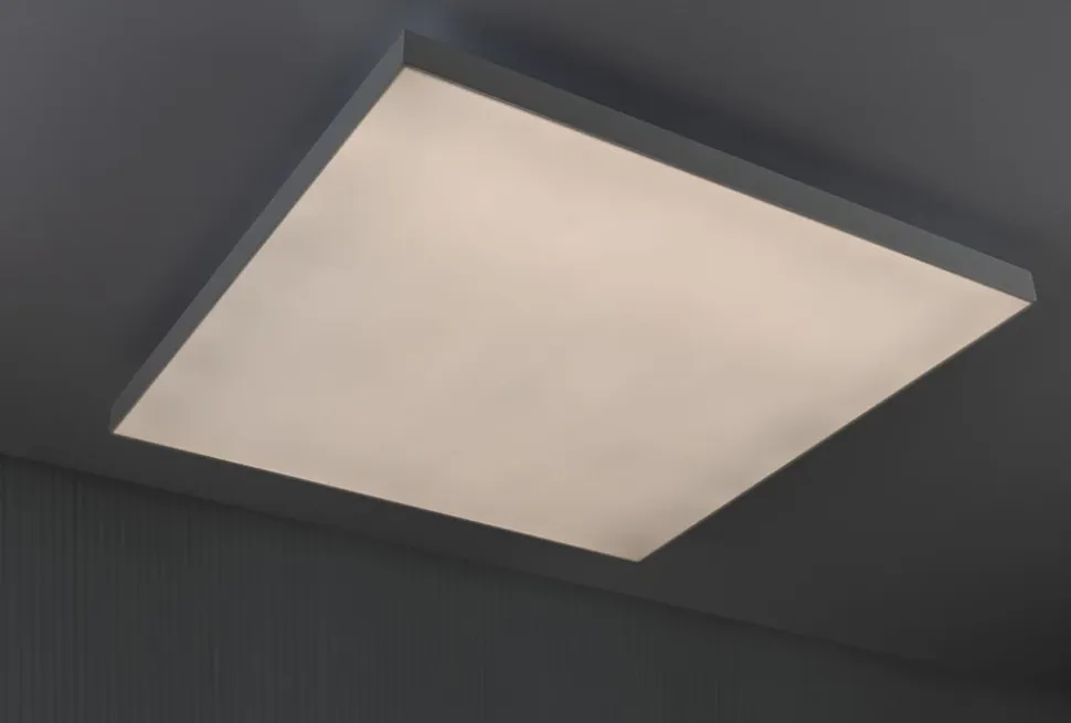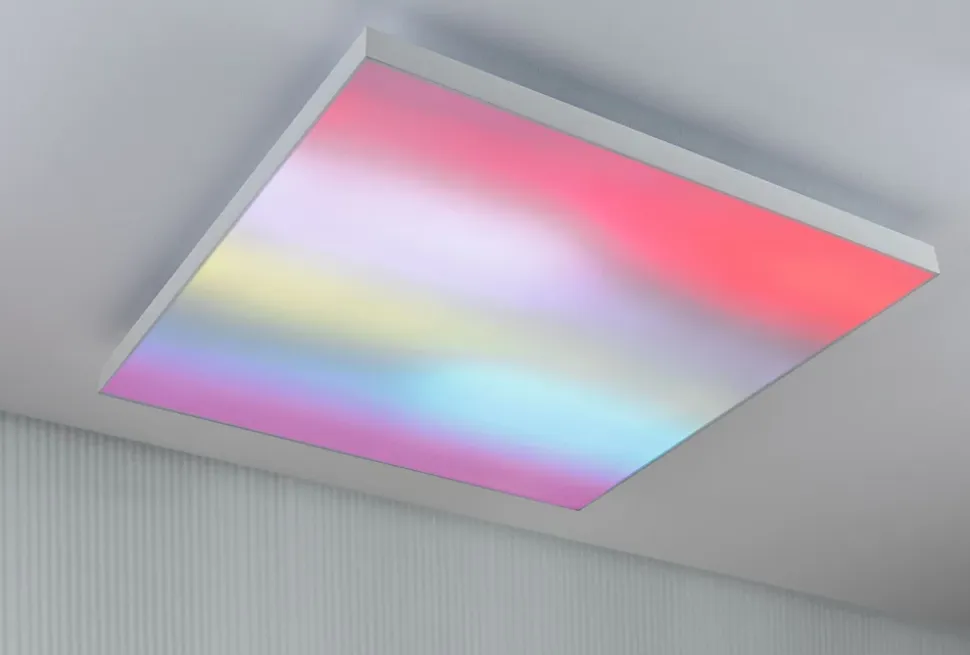 Pour des effets lumineux spectaculaires dans le salon – Le panneau LED Velora Rainbow de couleur Blanc et de dimensions 595x595mm, allie un excellent éclairage de la pièce à la pure magie des couleurs, car ici, les meilleures caractéristiques d’éclairage se trouvent combinées à des effets de couleur dynamiques. La température de couleur est réglable en continu par télécommande, de 3000 K blanc chaud à 6500 K blanc lumière du jour, ce qui est propice au biorythme naturel. Le panneau LED vous séduira aussi avec ses 16 animations prédéfinies et son contrôle dynamique des couleurs, qui ne sont possibles qu’avec un éclairage étendu. La vitesse de chaque scénario d’éclairage peut être adaptée ou figée comme un plan fixe. Cela permet de créer un éclairage étendu unique et individuel. Le panneau LED Velora Rainbow est réglable en continu et dispose d’une fonction veilleuse intégrée. Le panneau se distingue par sa surface lumineuse dépolie de haute qualité et par son design élégant dépourvu de bord. La pose au mur ou au plafond se fait au moyen d’un cadre flottant.