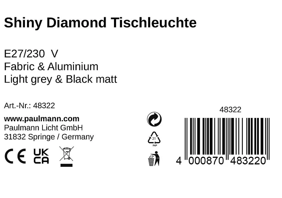 La lampe à poser Shiny Diamond forme un formidable accroche-regard dans le salon ou la chambre à coucher. Le pied et l’abat-jour forment une unité harmonieuse, car la finition noire et brillante s’accorde parfaitement avec l’abat-jour en tissu gris clair. Le design sobre et moderne s’intègre parfaitement dans chaque espace de vie et assure une lumière chaude et confortable qui crée une ambiance individuelle et diffuse une atmosphère bienfaisante dans la pièce. La lampe à poser Shiny Diamond est fournie avec un câble, une prise et un interrupteur à cordon marche/arrêt. Votre produit Pauleen est donc d’une simplicité hors pair : Il te suffit de l’installer, l’équiper d’une ampoule et d’en profiter. Pauleen s’engage résolument pour des idées d’éclairage déco qui diffusent une atmosphère chaleureuse à la maison.
