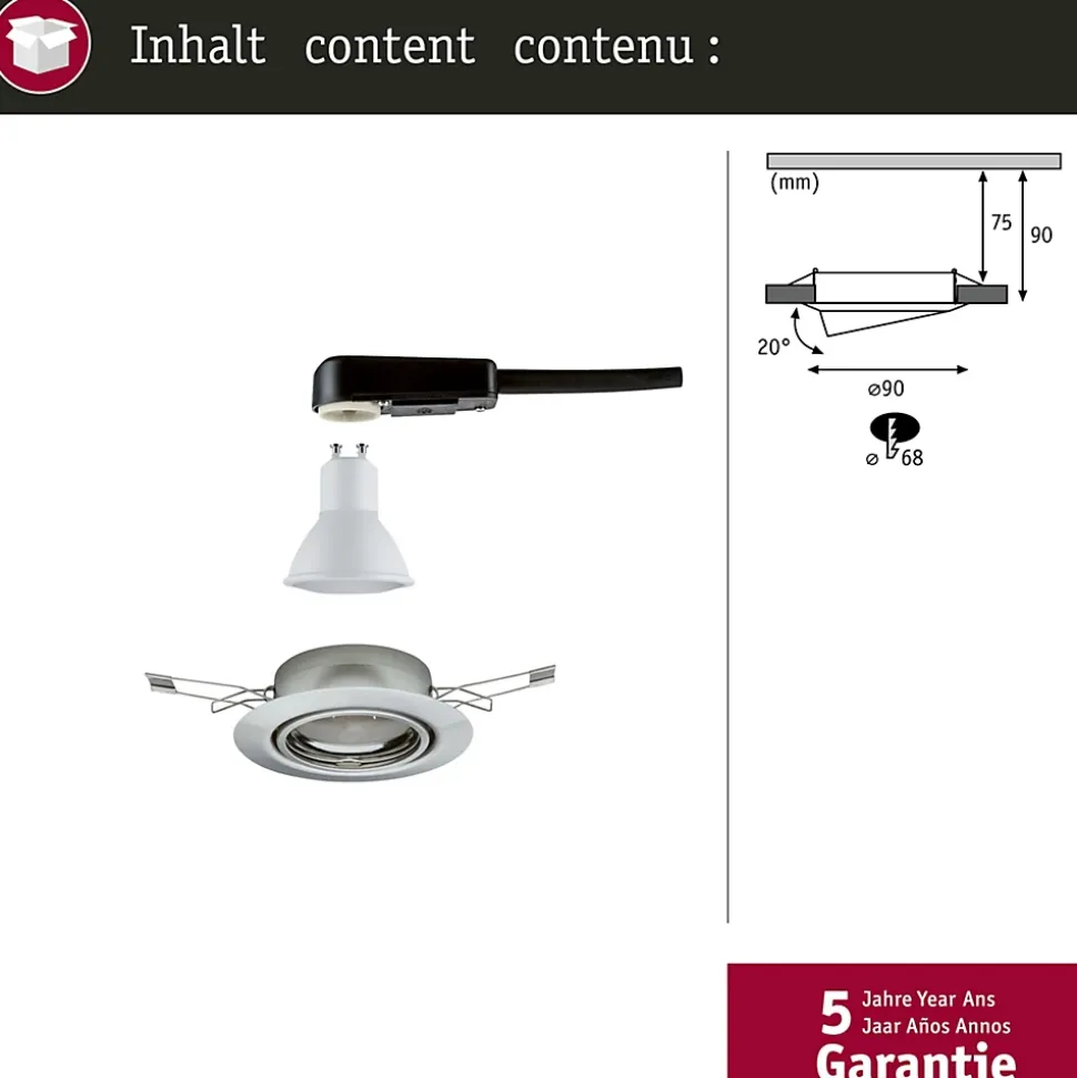 - Puissance 5 W, profondeur d’encastrement 90 mm, indice de protection IP23.