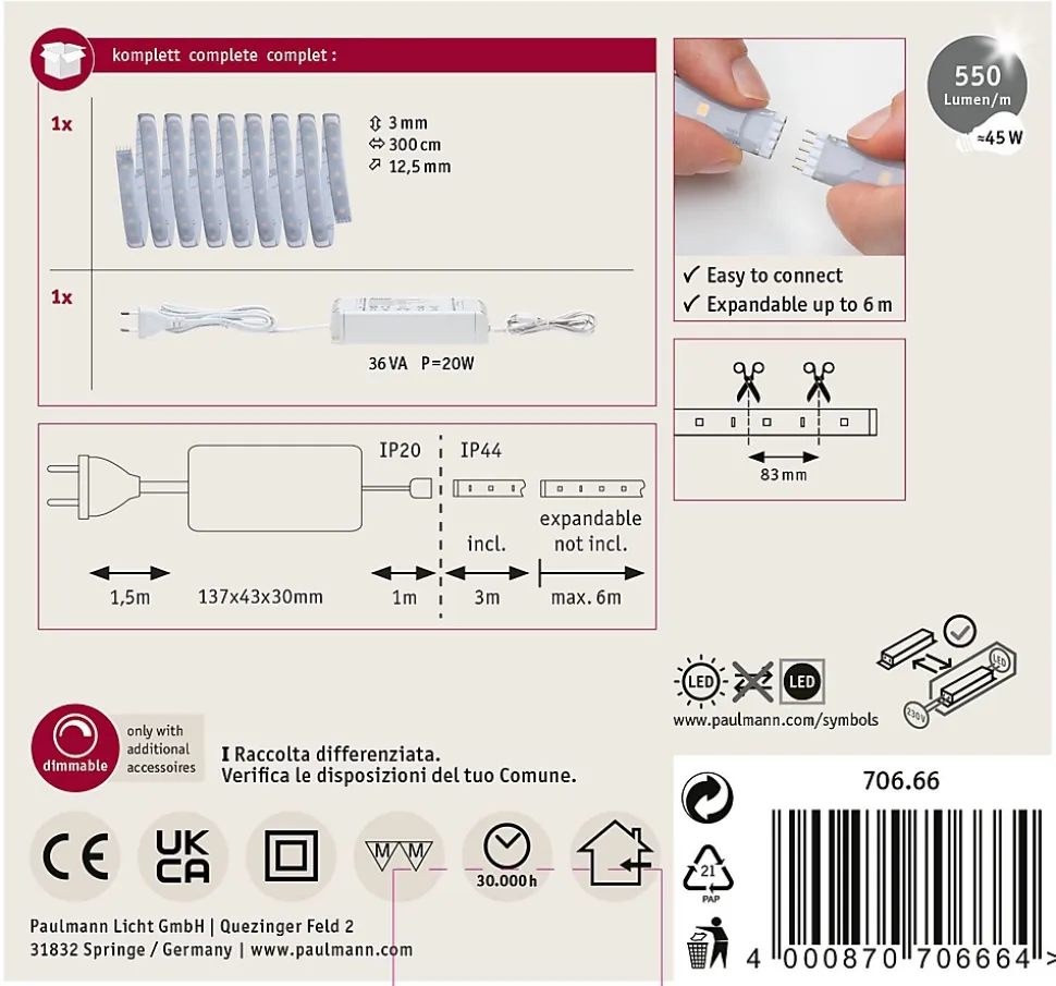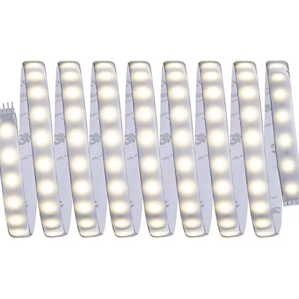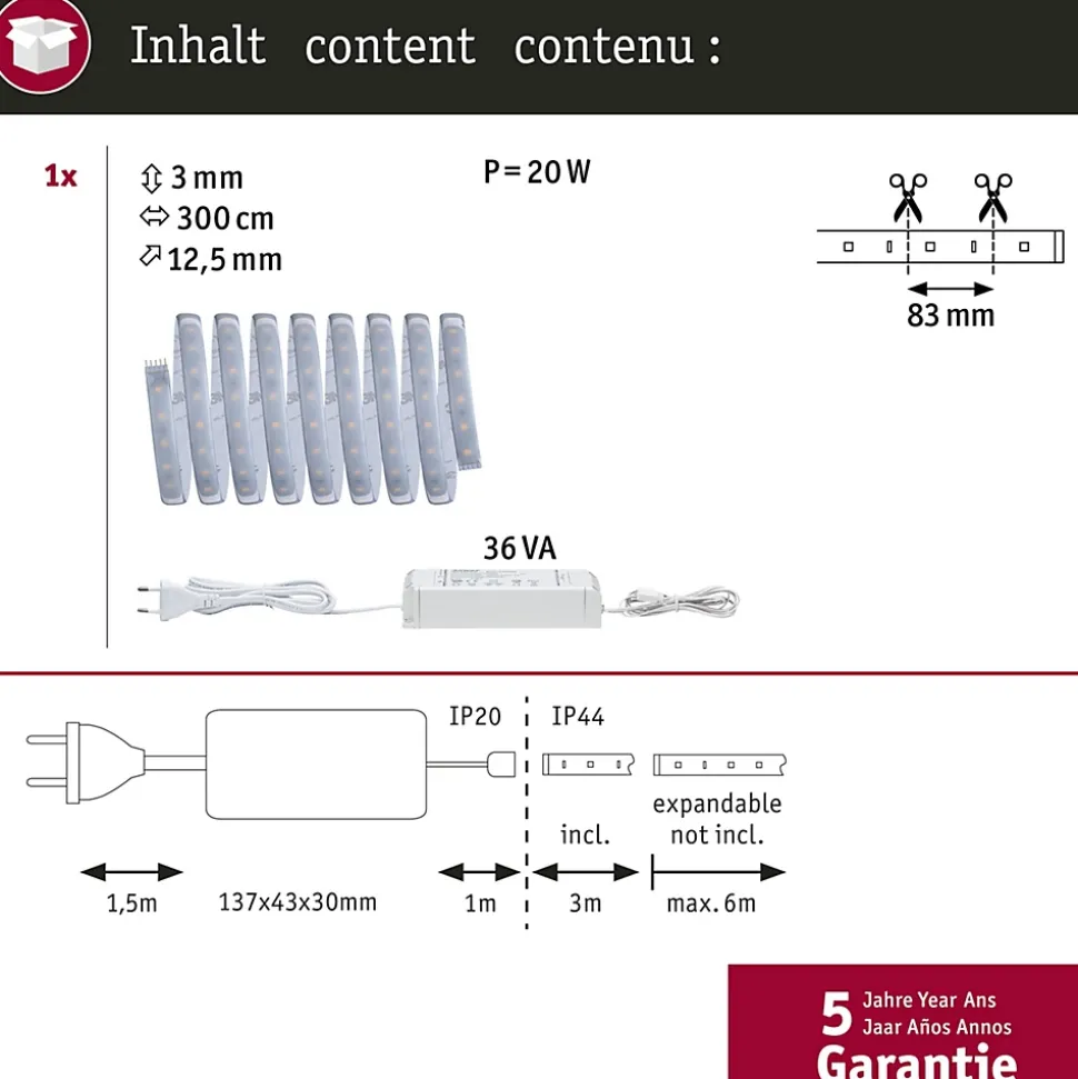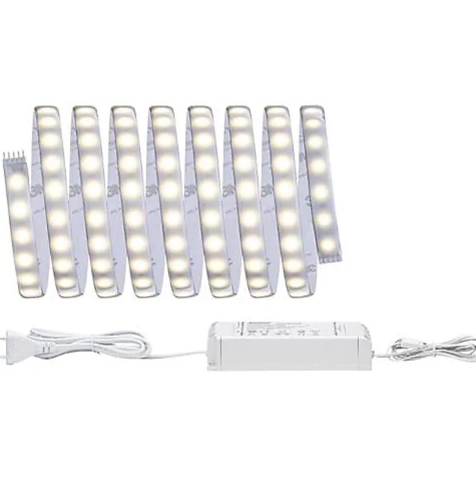 Ruban à LED Paulmann MaxLED 500 modèle 70666, longueur 3 m, blanc chaud 2700 K, puissance 20 W et flux total 1650 lm. Fonction dimmable, tension d’alimentation 24 V, connexion par connecteur mâle. Bande flexible, autocollante et découpable, adaptée aux profilés et à l’éclairage d’intérieur. Kit de base livré avec bloc d’alimentation et notice, extensible jusqu’à 6,2 m à l’aide de bandes et raccords supplémentaires. Équipé d’un revêtement de protection contre les projections d’eau et la poussière, utilisable dans les pièces humides avec gaine thermorétractable. Classe de protection II, matériau plastique, finition transparente brillante.