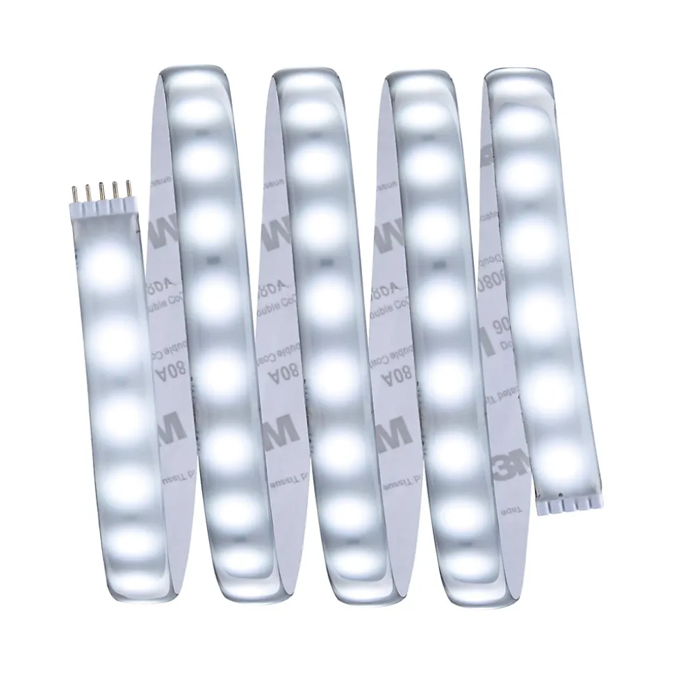 Ruban LED Paulmann MaxLED 500 prêt à l’emploi, livré en kit avec alimentation et connecteur mâle. Couleur blanc lumière du jour 6500 K, 150 cm autocollant et découpable, extensible jusqu’à 6,2 m. Flexible, dimmable et adapté aux environnements humides avec gaine, idéal pour éclairage d’intérieur et profilés.