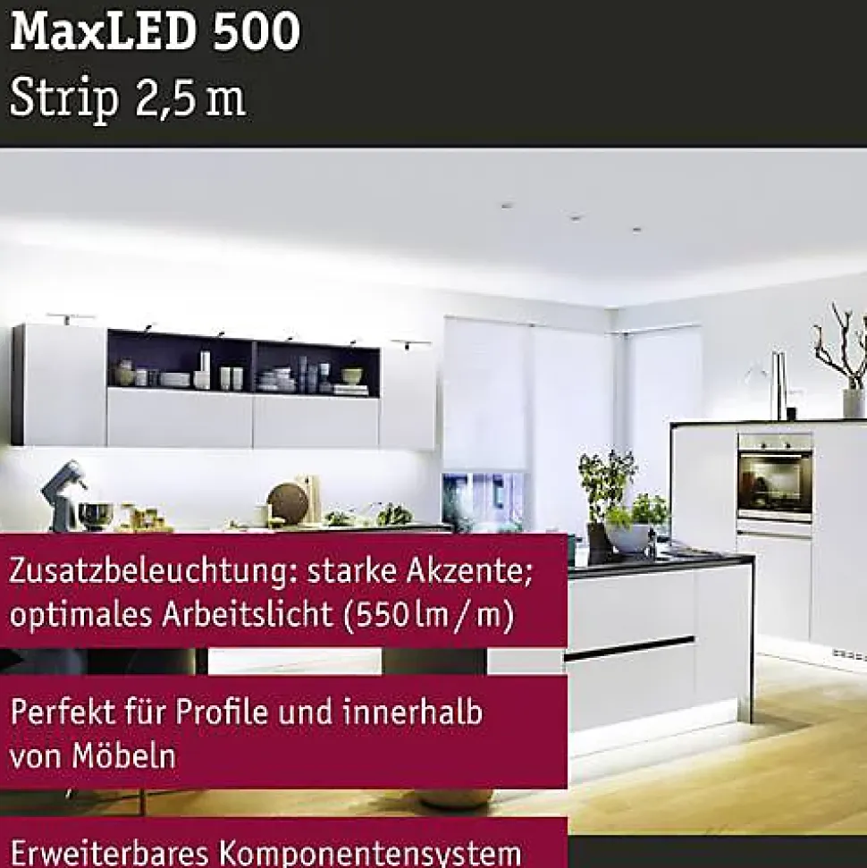 Ruban LED d’extension MaxLED 500 de Paulmann, 2,5 m, offre une lumière blanc jour 6500 K, 1375 lm et 14 W. Autocollant et flexible, il se raccorde facilement via connecteur mâle sur une alimentation 24 V et s’intègre aux profils pour un éclairage fonctionnel. Dimmable avec contrôleur dédié, adapté pour usage intérieur et installations modulaires.