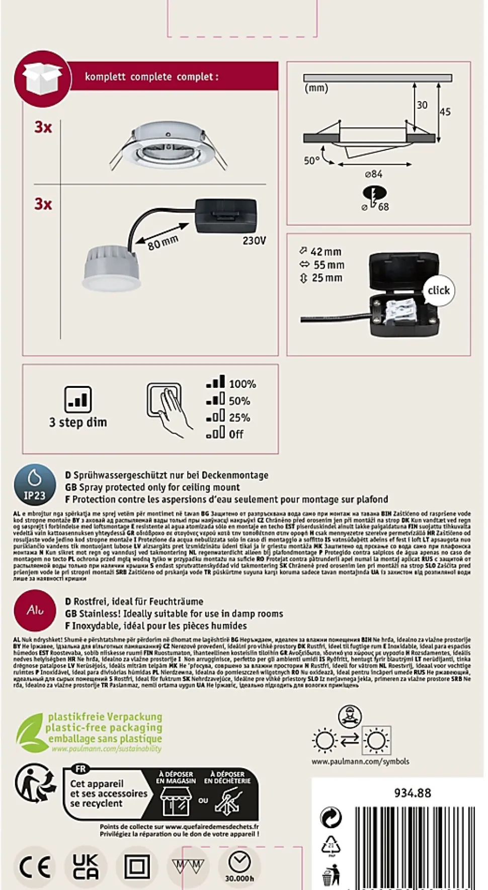 Kit composé de 3 luminaires fourni avec module LED|Température de couleur: 2700K – Blanc chaud|Pour raccordement direct au secteur 230V|Un simple commutateur permet de faire varier la luminosité sur 3 niveaux
