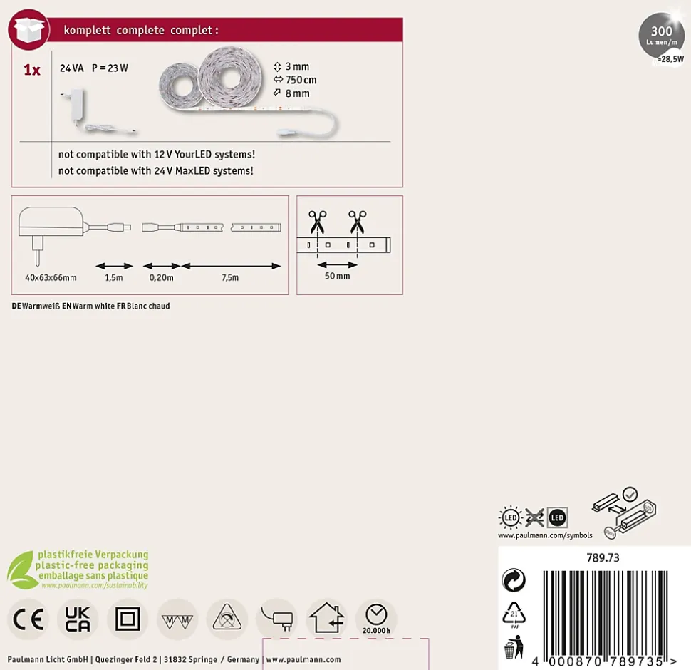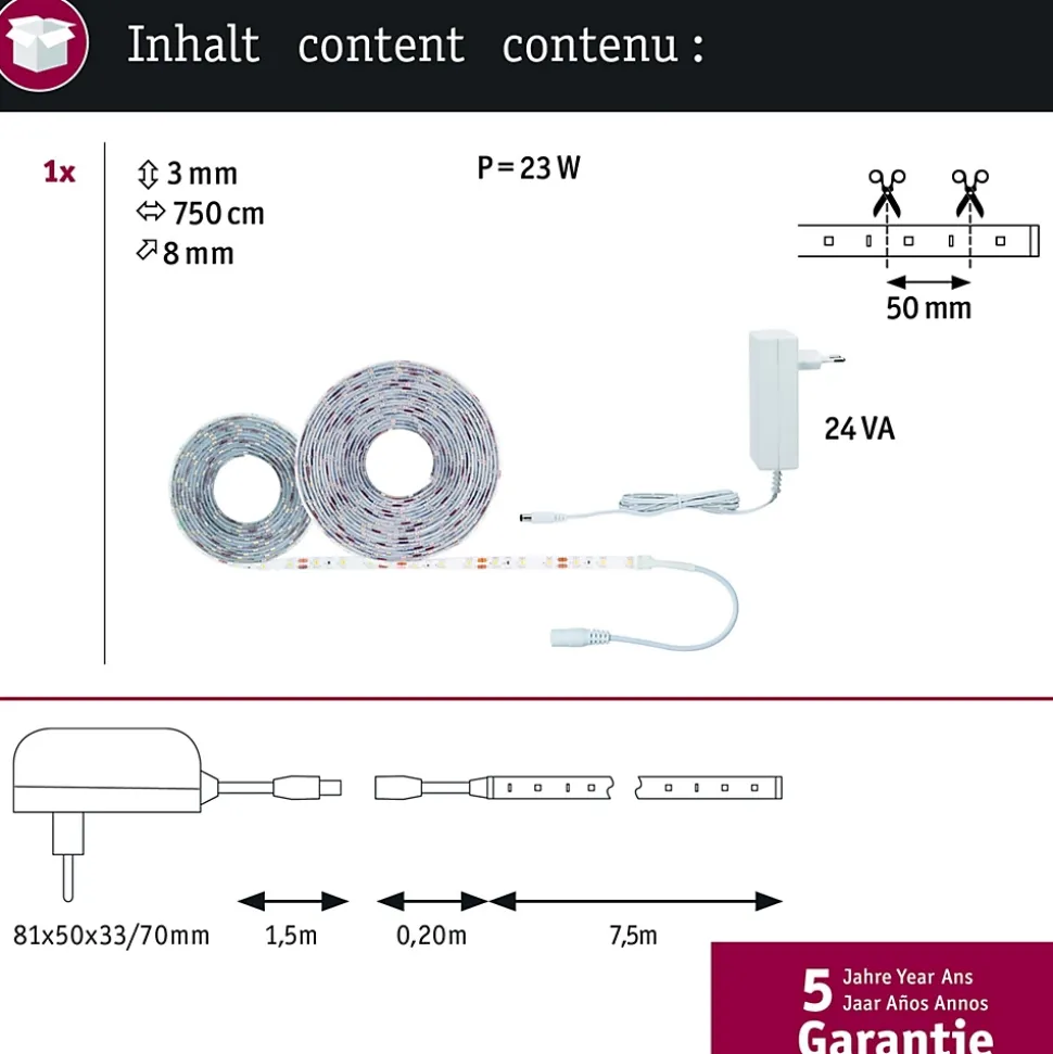 Ruban LED SimpLED Paulmann 7,5 m, kit prêt à l’emploi avec alimentation 230/12 V, éclairage blanc chaud 3000 K et flux 1440 lm. Flexible, autocollant et raccourcissable, il s’installe facilement sur surfaces planes ou courbes et offre un rendu colorimétrique soigné pour un éclairage d’ambiance intérieur.