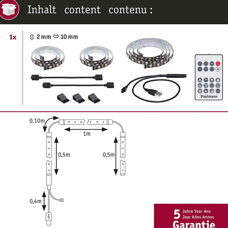 Ruban LED Paulmann TV Strips 55″ prêt à l’emploi, longueur 2 m, 60 LED/m, puissance 3 W, tension 5 V, couleur d’éclairage RVB. Conçu pour le rétroéclairage de téléviseurs 55 pouces, il se branche sur un port USB et offre des effets lumineux dynamiques grâce à sa télécommande infrarouge. Fonction dimmable et mémoire du dernier niveau d’éclairage. Matériau plastique, largeur 10 mm, hauteur 2 mm, poids 134 g. Non compatible avec les bandes YourLED et MaxLED, alimentation via USB, utilisation intérieure.