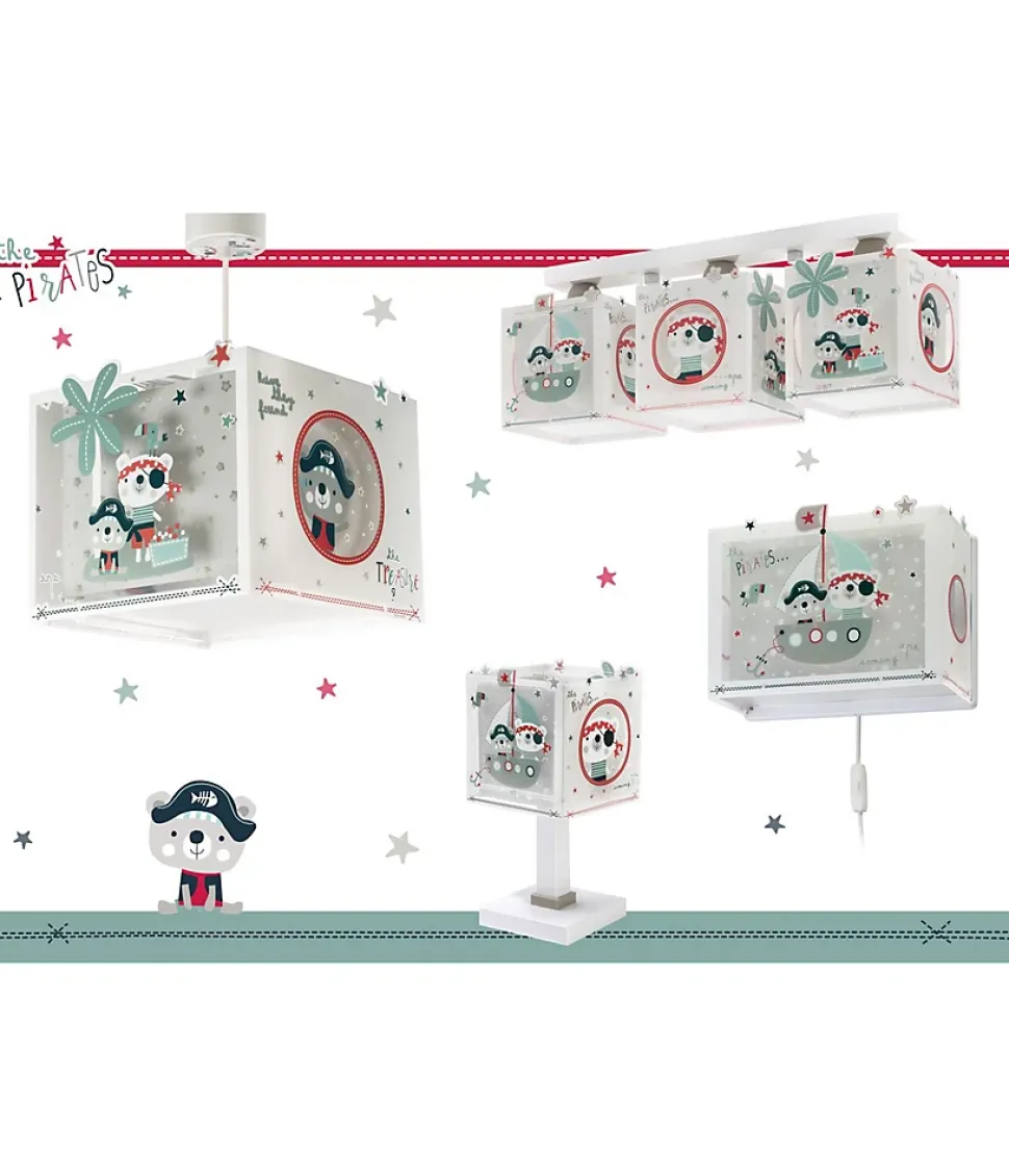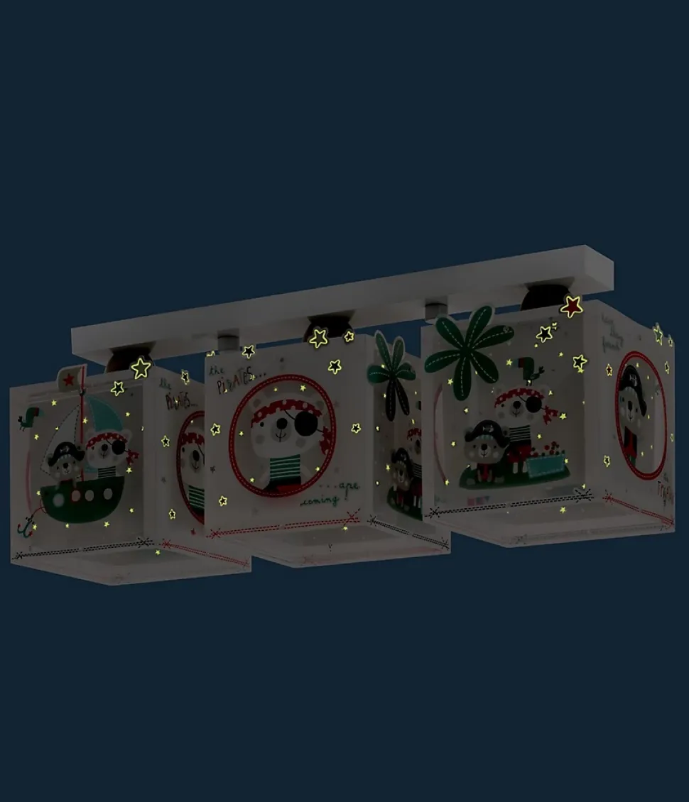 Lampe plafonnier enfant The PiratesVoici notre lampe plafonnier pour enfant The Pirates avec 3 lumières de la collection The Pirates. Il dispose d’un double écran en polypropylène transparent, avec les ours pirates en partie haute sur fond d’étoiles. Installez le plafonnier directement au plafond et obtenez une lumière uniforme dans toute la pièce, sans zones sombres.Plafonnier pour chambre d’enfant avec fluorescenceSavez-vous que le plafond des Pirates brille dans le noir ? Il a un effet de fluorescence qui, une fois chargé grâce à l’utilisation du plafond, vous donnera quelques minutes d’éclat dans le noir. Les plus petits adorent voir les étoiles s’illuminer autour des ours !