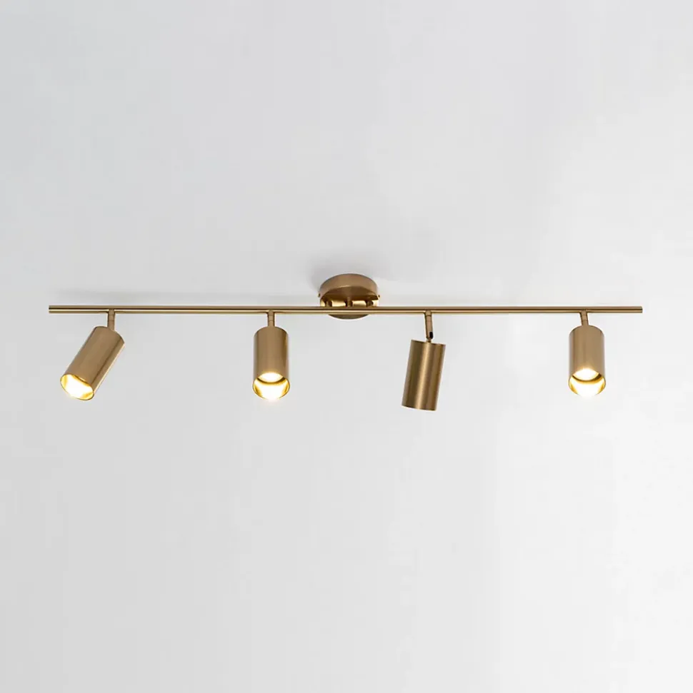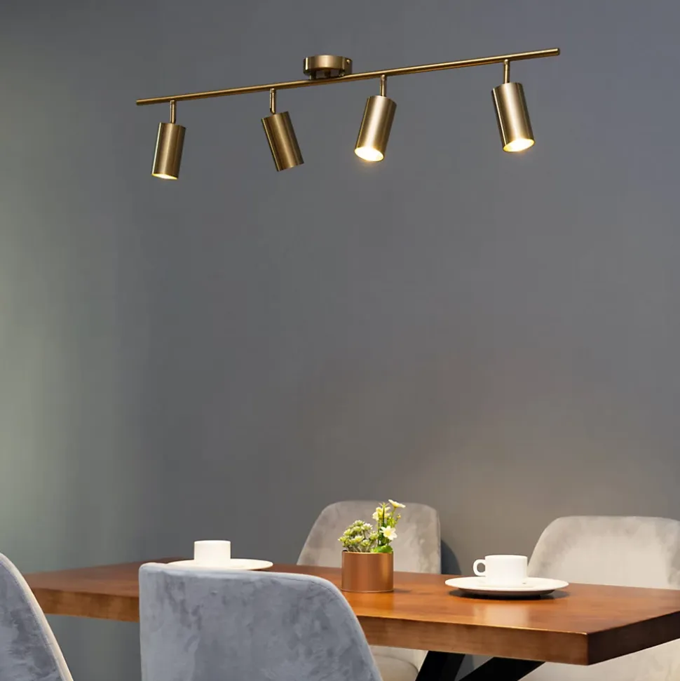 Transformez votre espace avec le plafonnier à spots multiples Estrid en métal et aluminium couleur laiton. Idéal pour éclairer cuisine, couloir ou surface de travail, ce luminaire moderne de 1 mètre de long sur 20 cm de hauteur utilise 4 ampoules GU10. Son design sobre s’adapte facilement à tout intérieur. Les têtes orientables le long de la barre centrale assurent une répartition harmonieuse de la lumière, créant un jeu d’ombres captivant. Compact et discret, Estrid maintient la lumière proche du plafond.) Assemblage simple requis (