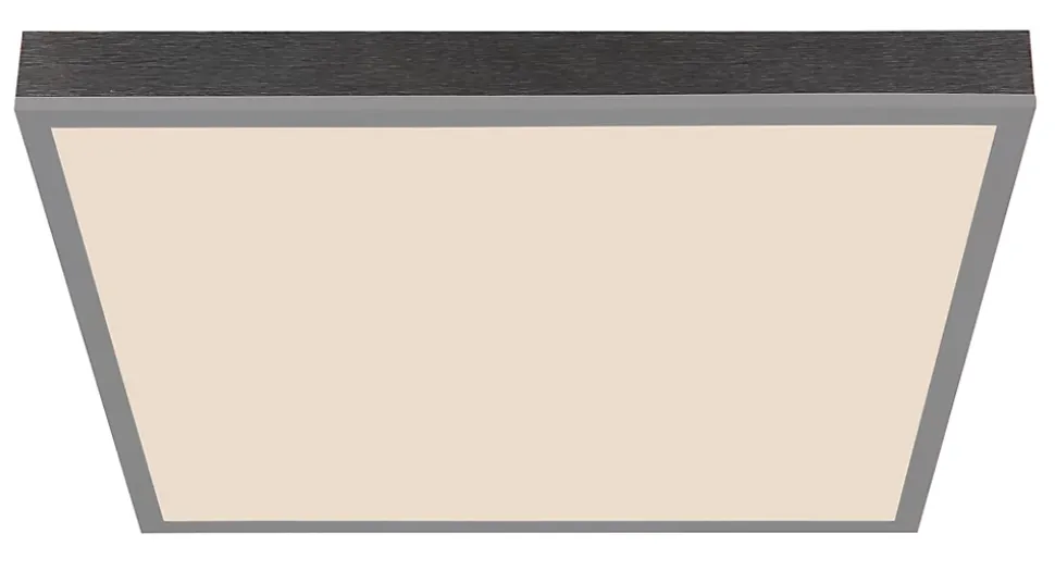 Plafonnier aluminium couleur argent, MDF gris foncé, plastique opale, Dimmable, Plusieurs intensités à gérer par un interrupteur mural, couleur fixe, Fonction de mémoire, Veilleuse, Timer, Télécommande, Batterie incluse 2x AAA, LxPxH: 450x450x75mm, incl. LED 24W 230V, 250-2500lm Source, 160-1600lm Output, CCT 2700-6500K