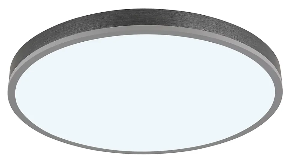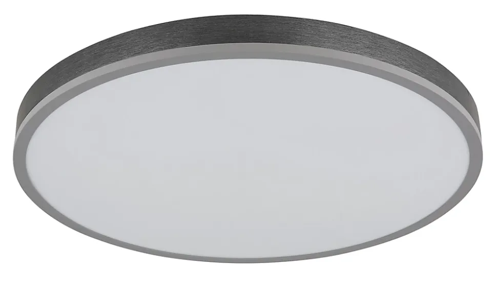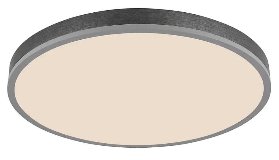 Plafonnier aluminium couleur argent, MDF gris foncé, plastique opale, Dimmable, Plusieurs intensités à gérer par un interrupteur mural, couleur fixe, Fonction de mémoire, Veilleuse, Timer, Télécommande, Batterie incluse 2x AAA, ø: 600mm, H: 85mm, incl. LED 40W 230V, 415-4150lm Source, 205-2050lm Output, CCT 2700-6500K