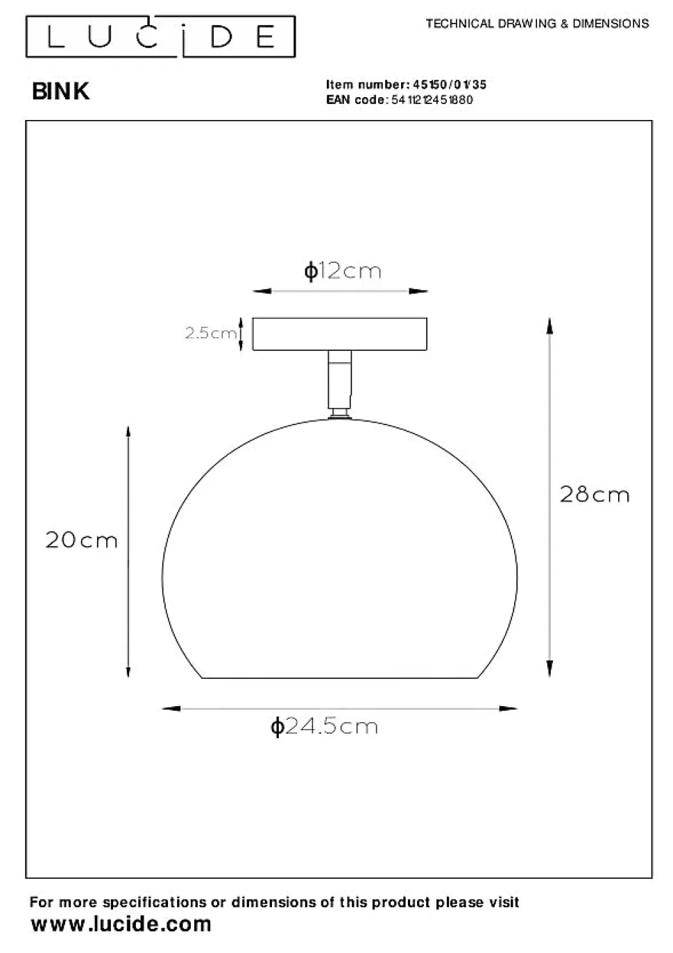 À la recherche d’une beauté pour votre intérieur ? Répondez littéralement à cette envie avec ce joli plafonnier. Bink se compose d’un abat-jour parfaitement sphérique d’un diamètre de 25 centimètres. Le métal de haute qualité confère immédiatement à cette lampe un aspect élégant et moderne. L’abat-jour peut également être tourné. Vous choisissez donc l’endroit dans lequel vous souhaitez créer une atmosphère chaleureuse avec la source lumineuse LED. En parlant d’ambiance, ce plafonnier élégant est facile à connecter à un variateur d’intensité. Bink illumine chaque moment privilégié de votre foyer.Caractéristiques uniques:• Utilisable avec une source lumineuse LED• Facile à connecter à un variateur (non fourni)• Fabriqué en métalPrincipales caractéristiques du produit:• Consommation énergétique: 1x40W / 230V / A intensité variable (Ampoule non incluse)• Dimensions: Ø24,5 cm Haut.28 cm• 2 Ans garantie sur le luminaire / source de lumière appropriée est EAN: 5411212491152Pourquoi choisir l’éclairage Lucide?Lucide incarne un design innovant, un savoir-faire artisanal et une fiabilité exemplaire. En tant qu’entreprise familiale belge avec plus de trois décennies d’expertise, nous concevons des éclairages de haute qualité qui enrichissent et transforment chaque espace, tant intérieur qu’extérieur. Notre collection polyvalente comprend des luminaires durables et des sources lumineuses économes en énergie, soigneusement conçus par nos propres experts et fabriqués selon les normes CE les plus strictes. Grâce à notre large gamme, nous vous proposons toujours une solution d’éclairage adaptée, quel que soit le style ou l’espace. Ainsi, nous illuminons non seulement votre espace de vie mais aussi votre processus de choix dans la recherche d’un éclairage de qualité et abordable. Chez Lucide, nous combinons innovation et savoir-faire pour un éclairage qui ajoute non seulement de l’ambiance, mais transf…